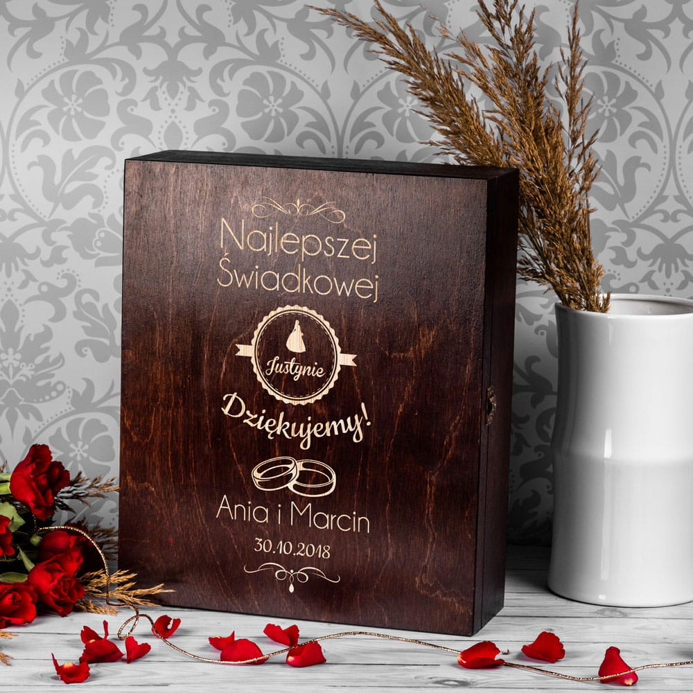 W ramach podziękowań świadkowej na ślubie podaruj jej wino w pięknej potrójnej skrzynce z grawerem Najlepszej Świadkowej, Dziękujemy.