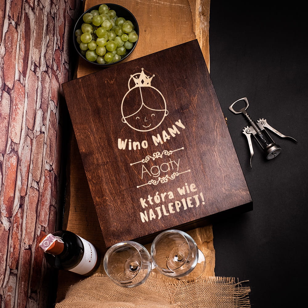 Wyjątkowy grawer jest ozdobą skrzynki i pięknie odznacza się na bejcowanym drewnie. Skrzynka stanie na honorowym miejscu w domu albo mieszkaniu mamy. Dzięki potrójnej skrzynce na wino wręczysz mamie doskonały prezent na Dzień Matki albo jej urodziny, który na pewno się spodoba.
