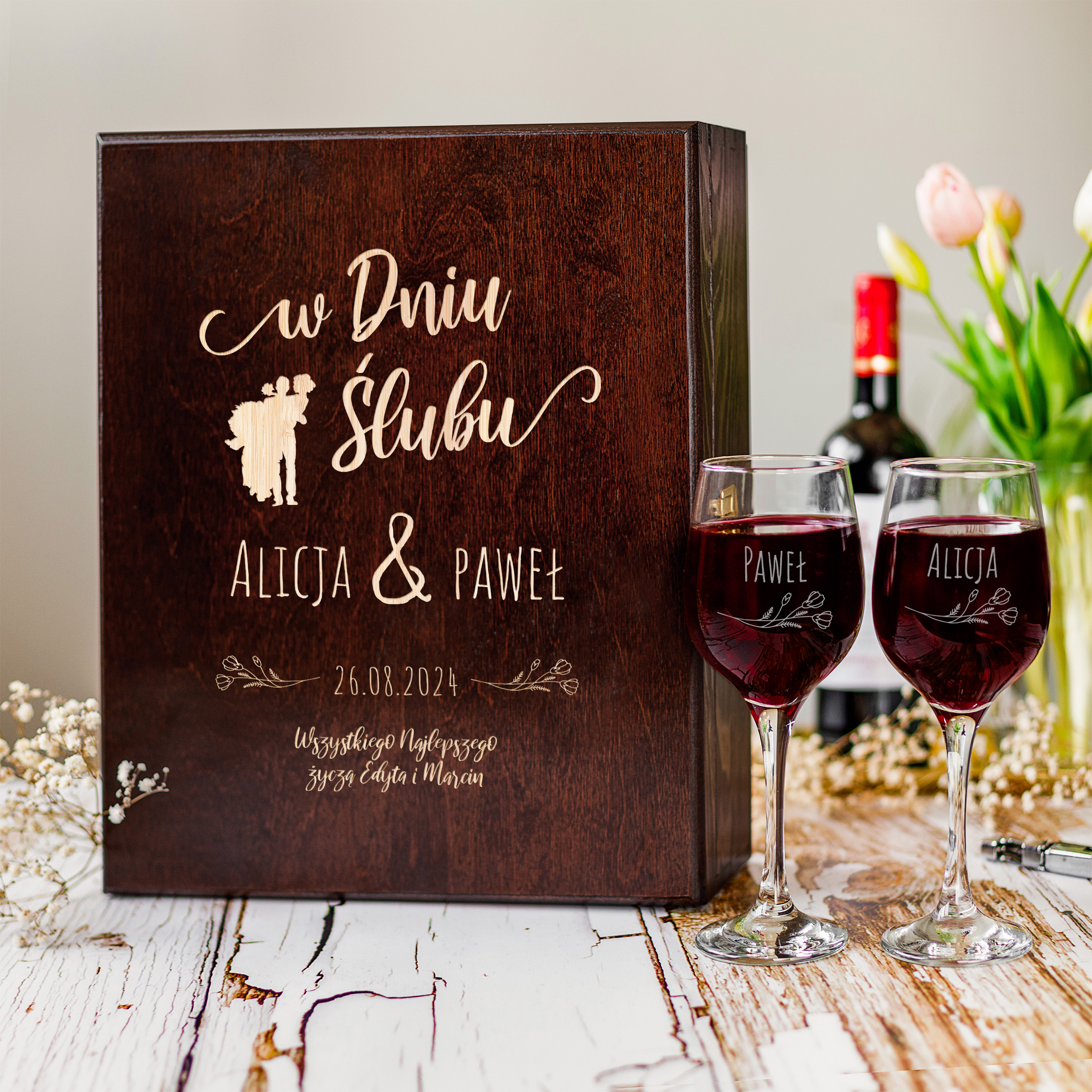 Skrzynka oraz kieliszki będą pamiątką ślubu i staną na honorowym miejscu w domu albo mieszkaniu. Zestaw dwóch personalizowanych kieliszków na wino to doskonały prezent na ślub dla koneserów wina. Elegancka skrzynka wykonana jest z drewna najwyższej jakości.