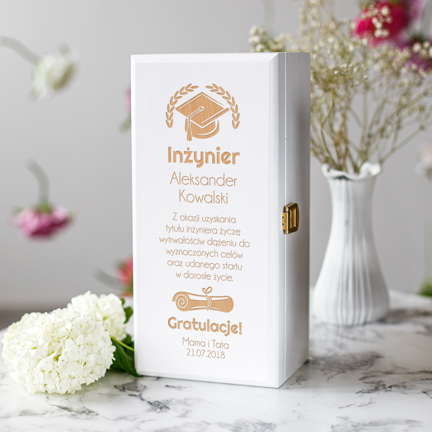 Skrzynka na alkohol z grawerem dla Inżyniera, Gratulacje! to oryginalny prezent na obronę pracy inżynierskiej!