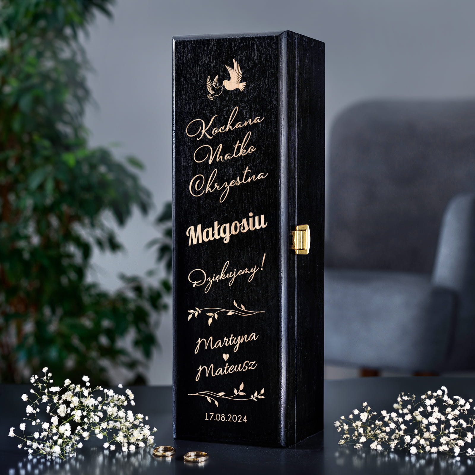PODZIĘKOWANIE DLA RODZICÓW CHRZESTNYCH, PODZIĘKOWANIE DLA MATKI CHRZESTNEJ, PREZENT NA ŚLUB SKRZYNKA Z GRAWEREM NA WINO, PUDEŁKO NA PREZENT