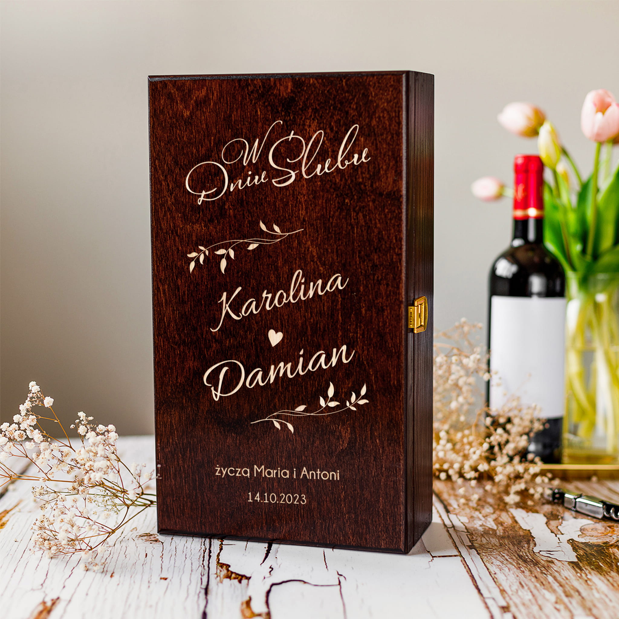 Skrzynka na Wino z Grawerem - Prezent na Ślub dla Pary Młodej - W Dniu Ślubu - Gałązki - Podwójna