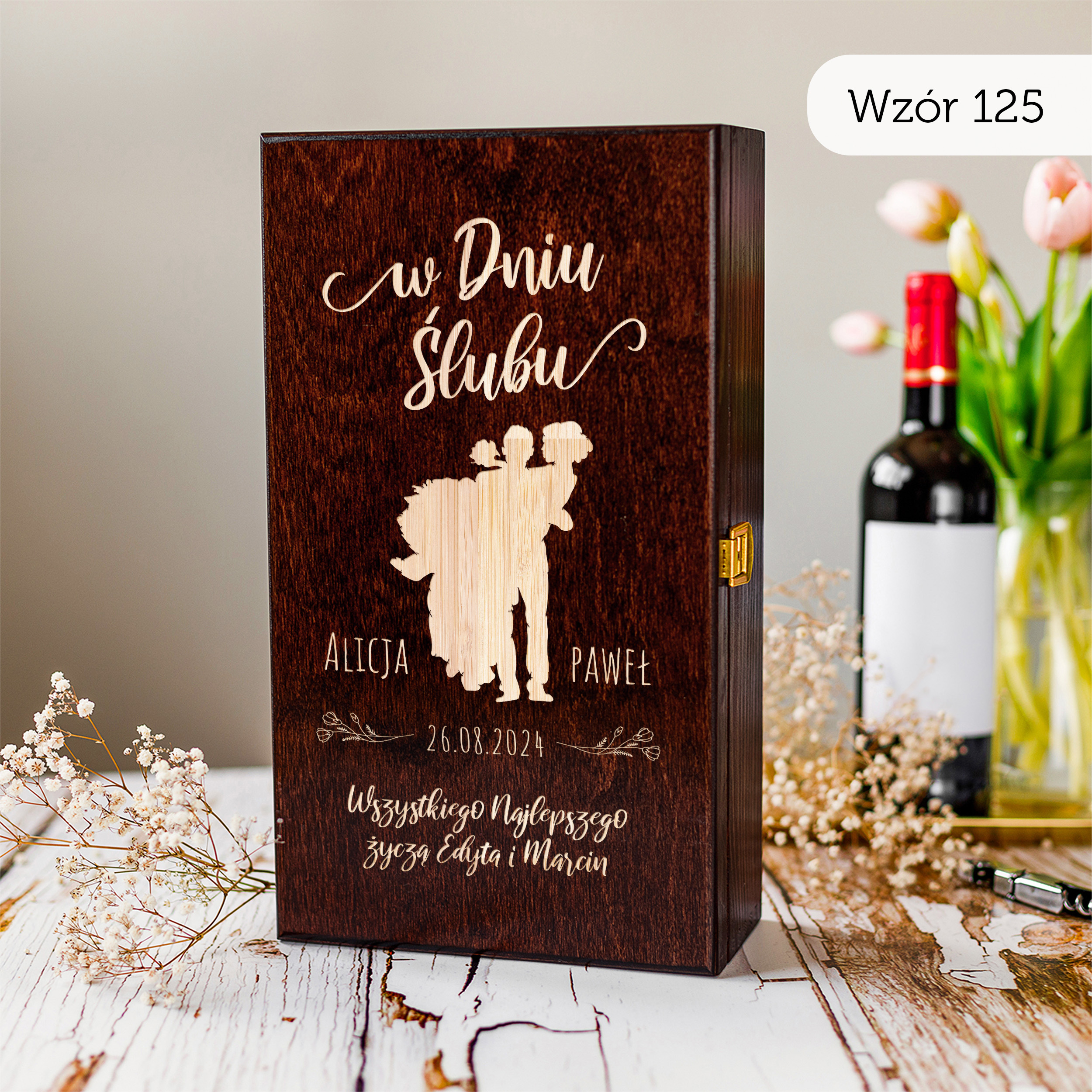 Skrzynka będzie pamiątką ślubu i stanie na honorowym miejscu w domu albo mieszkaniu. Dzięki podwójnej skrzynce wybór wina na prezent na ślub nie będzie żadnym problemem. Wyjątkowy grawer jest ozdobą skrzynki i pięknie odznacza się na bejcowanym drewnie.