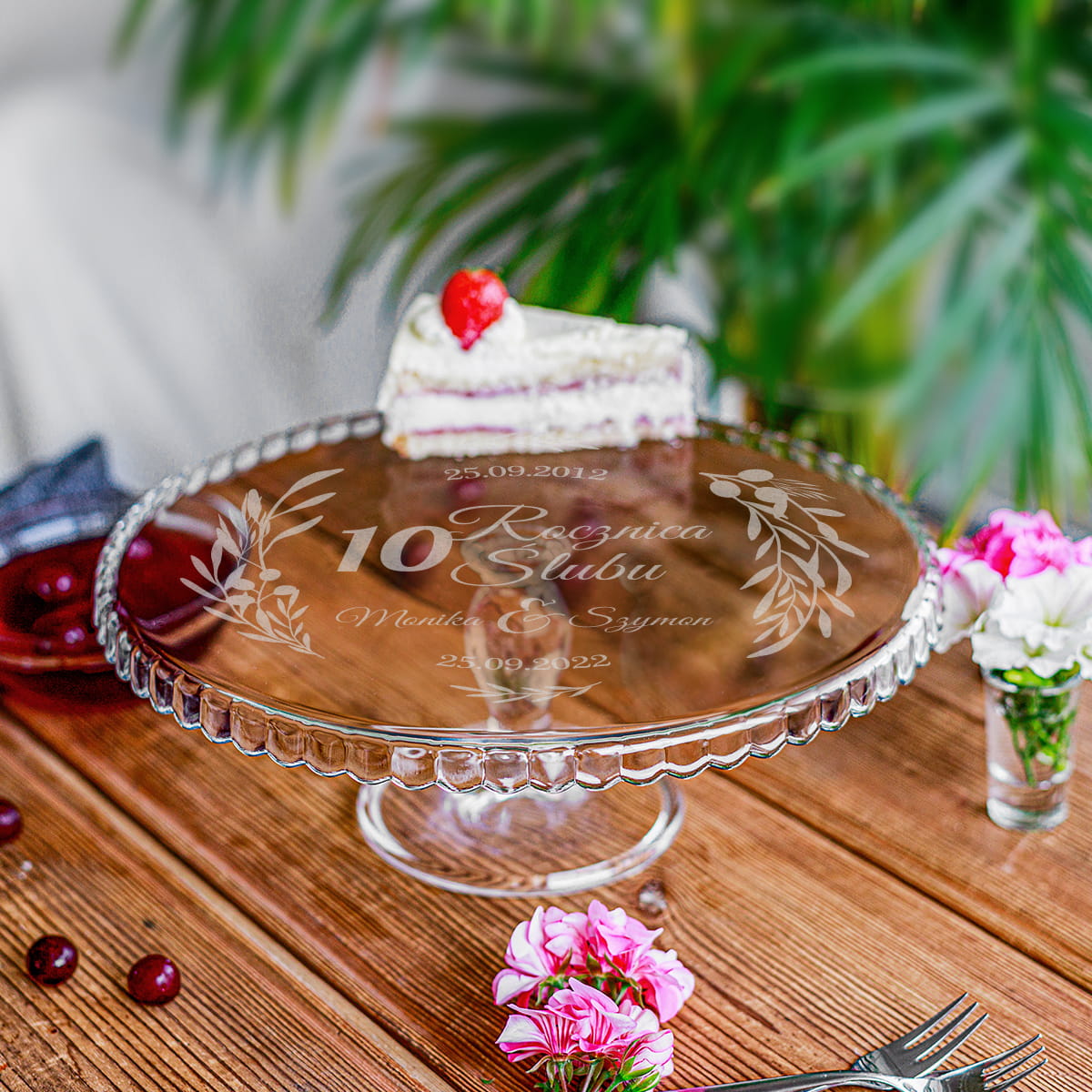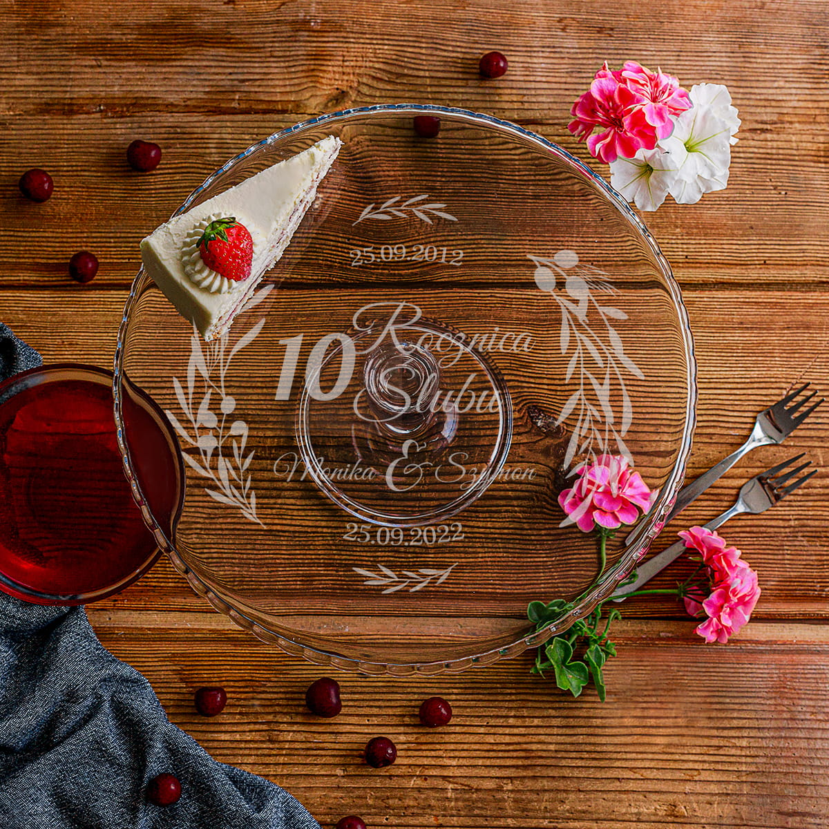 Szklana patera z grawerem na ciasto to idealny prezent dla fanów pieczenia lub gotowania z okazji rocznicy ślubu! Grawerowana patera na tort na rocznicę to oryginalny prezent który zrobi wrażenie na obdarowanych, a zarazem będzie praktyczny.
