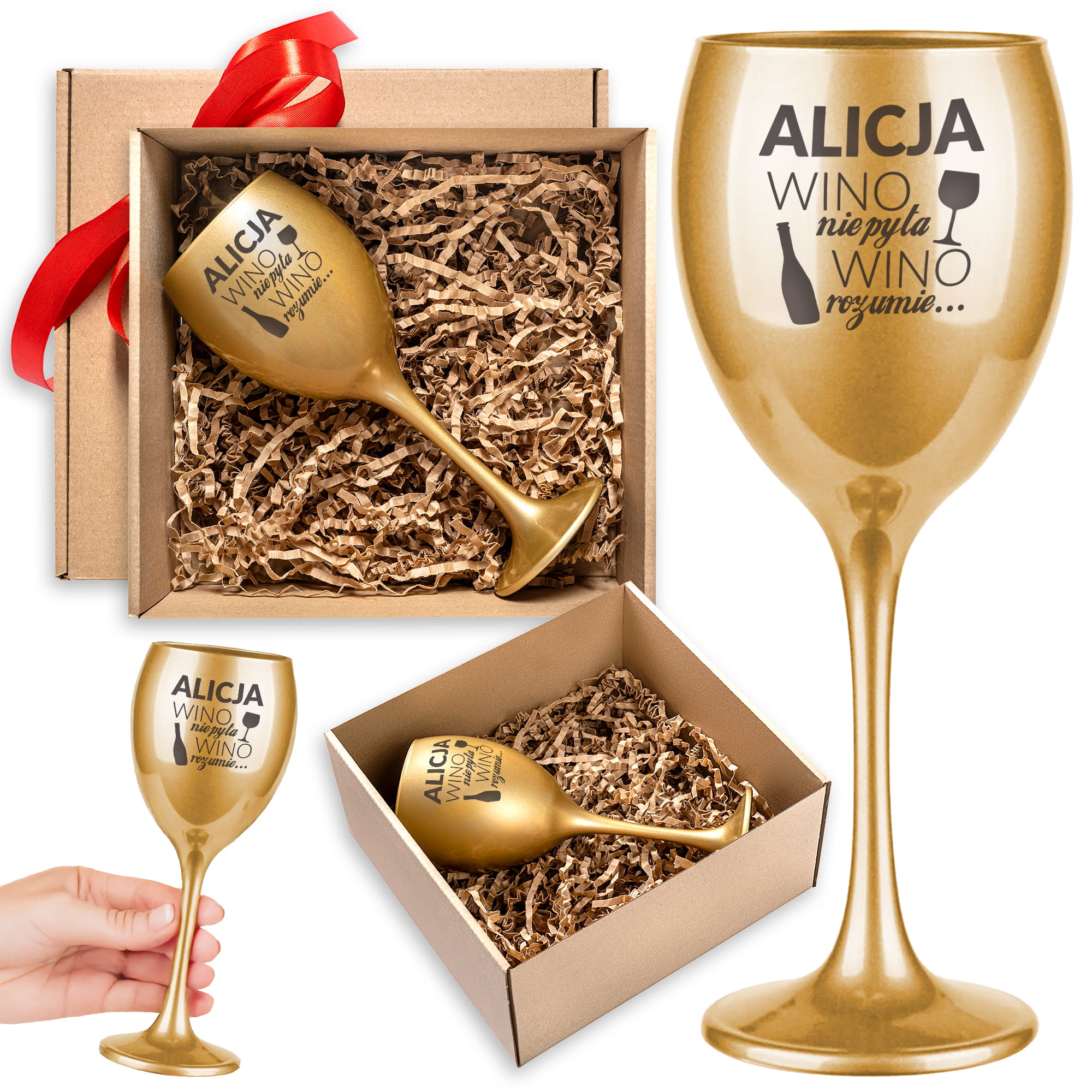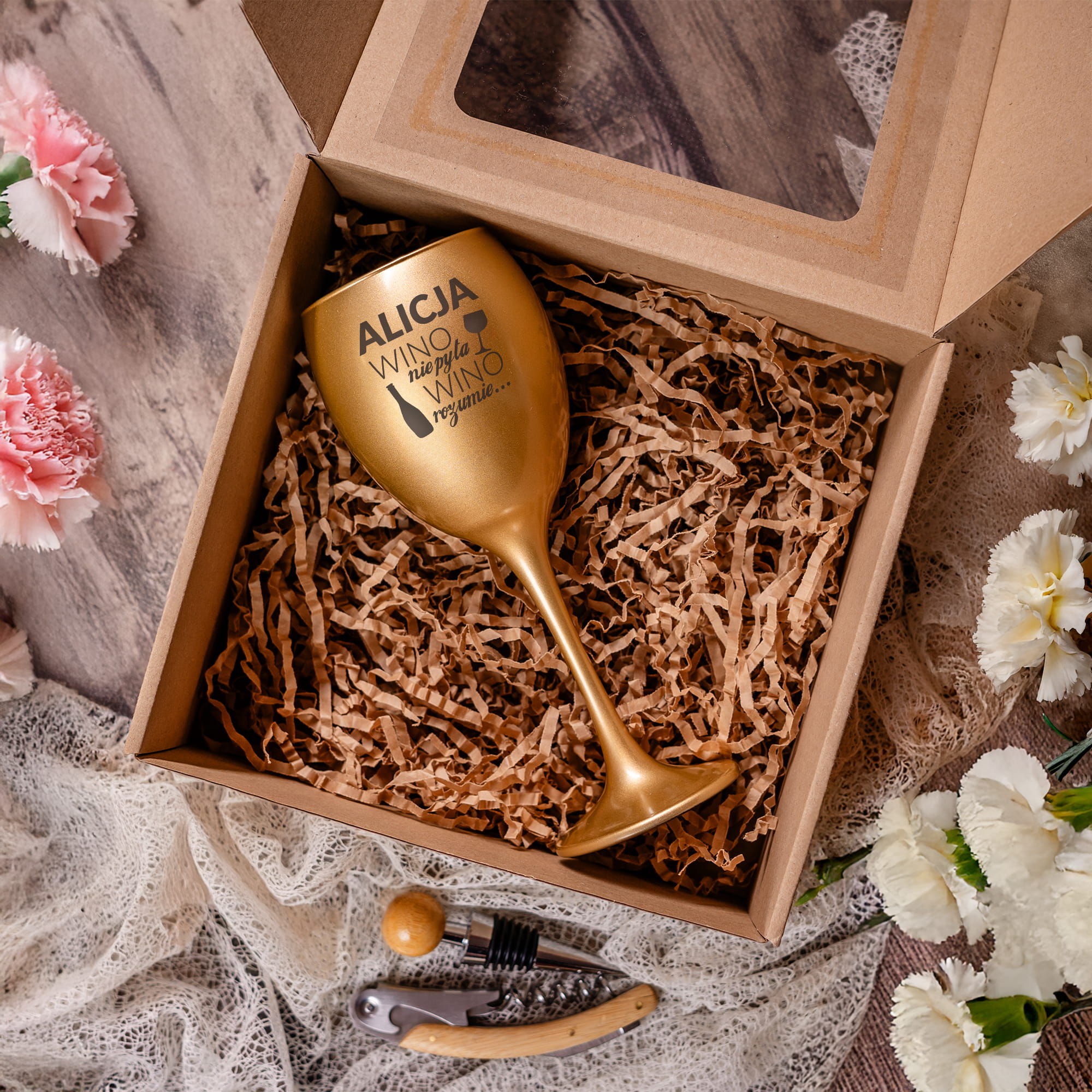 ZŁOTY KIELISZEK DO WINA Z GRAWEREM - ZESTAW PREZENTOWY DLA NIEJ - KIELISZEK Z IMIENIEM