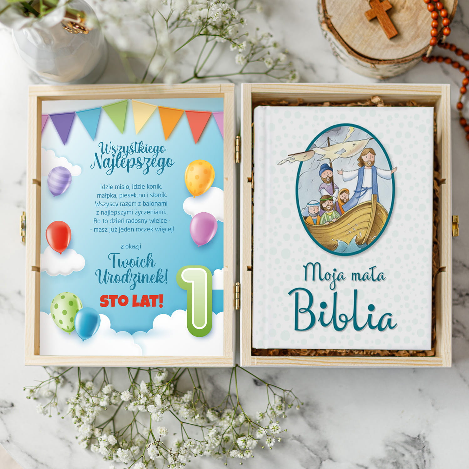 Prezent na Pierwsze Urodziny w formie biblii w drewnianym pudełku z życzeniami na kolorowej wklejce będzie idealnym prezentem zarówno dla chłopca jak i dla dziewczynki.