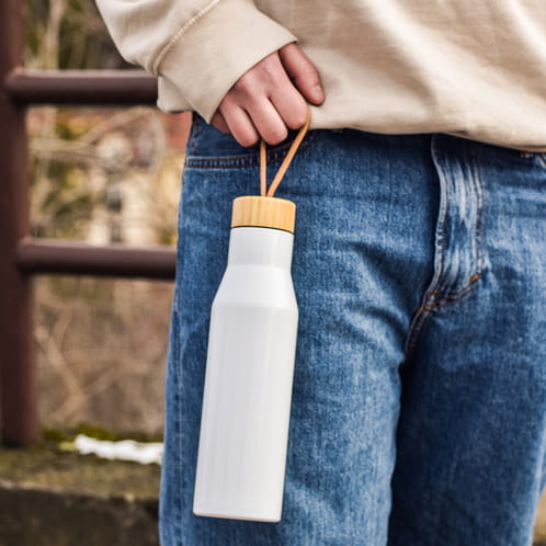 ⚡Szczelna butelka próżniowa o pojemności 500 ml. Wykonana ze stali nierdzewnej, posiada zakrętkę z bambusa.