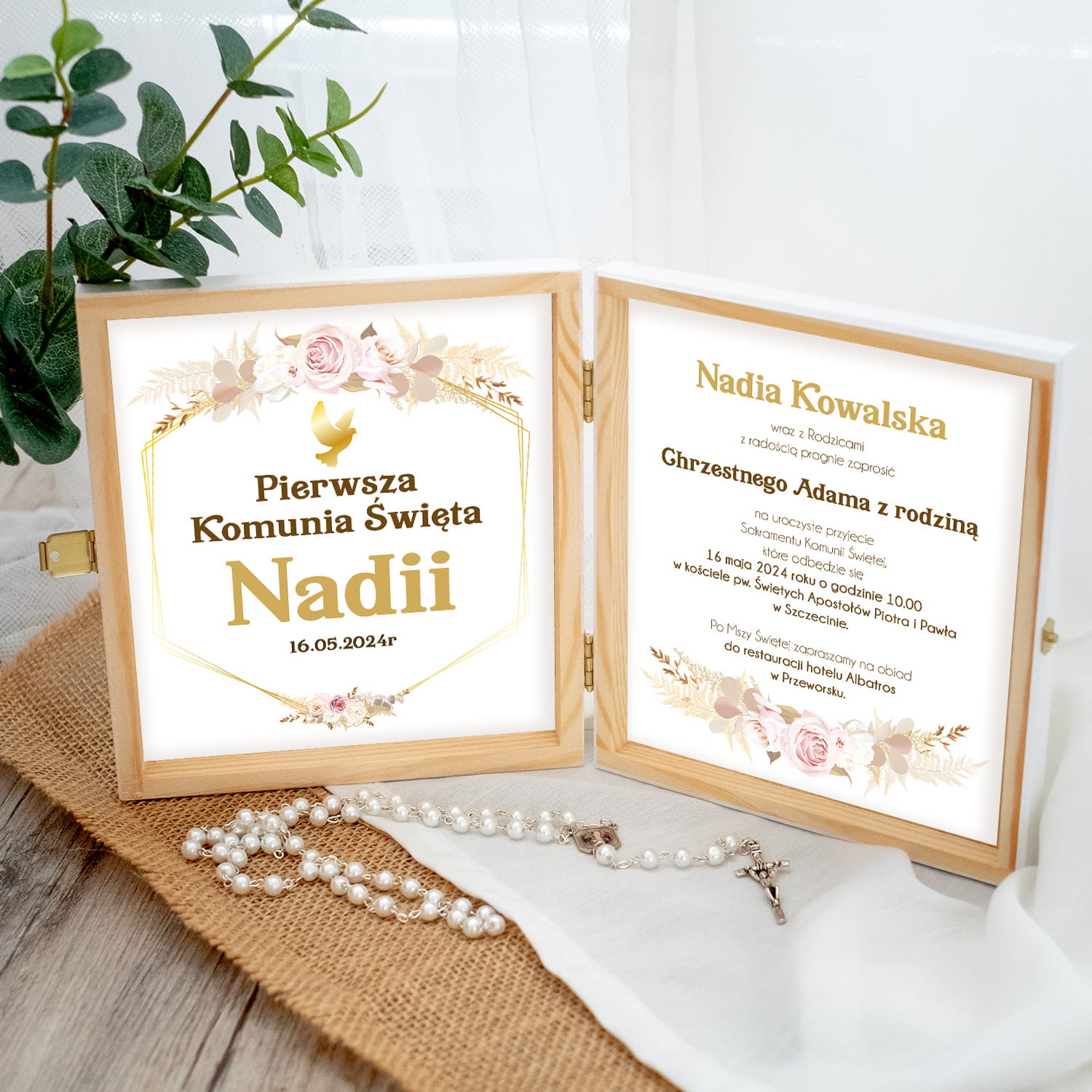 Planujesz jeden z najważniejszych dni Twojego życia? Zaproś rodziców chrzestnych na Pierwszą Komunię Świętą w naprawdę wyjątkowy sposób – wręcz im zaproszenie w drewnianym pudełku z imieniem, datą ceremonii oraz delikatnym motywem roślinnym.