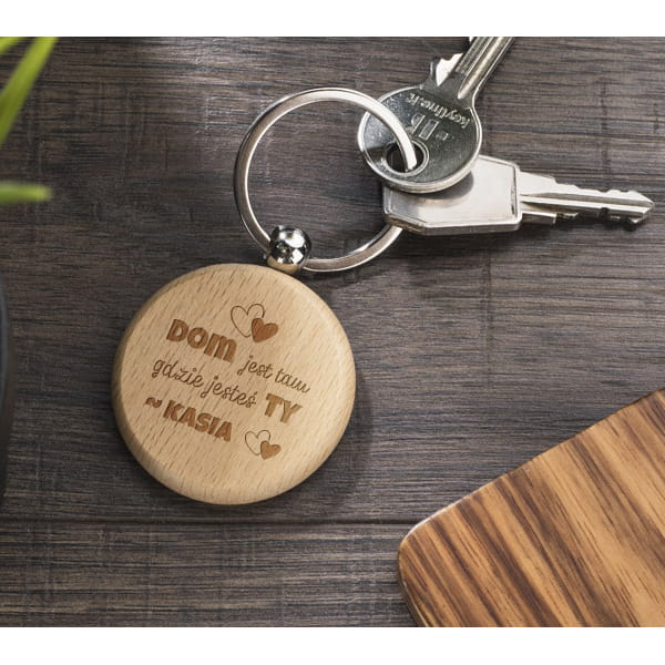 Szukasz wyjątkowego prezentu dla niej lub dla niego na dowolną okazję? Postaw na drewniany breloczek do kluczy z grawerem Dom Jest Tam Gdzie Jesteś Ty.
