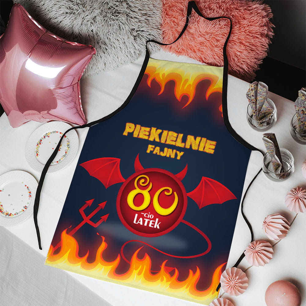 Szukasz śmiesznego prezentu na 80 urodziny? Wybierz fartuch kuchenny z nadrukiem Piekielnie Fajny 80ciolatek!