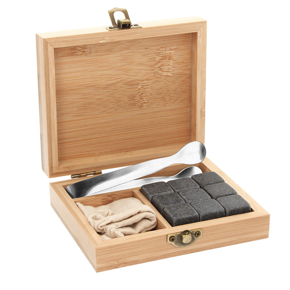 Na pewno po niego sięgnie za każdym razem, kiedy będzie chciał ugasić pragnienie. Dzięki niemu będzie mógł napić się pysznego alkoholu w odpowiedniej temperaturze bez konieczności każdorazowego przygotowywania nowych kostek lodu. Zestaw do whisky w bambusowym pudełku zawiera kamienie wielokrotnego użytku, bawełnianą sakiewkę i szczypce.
