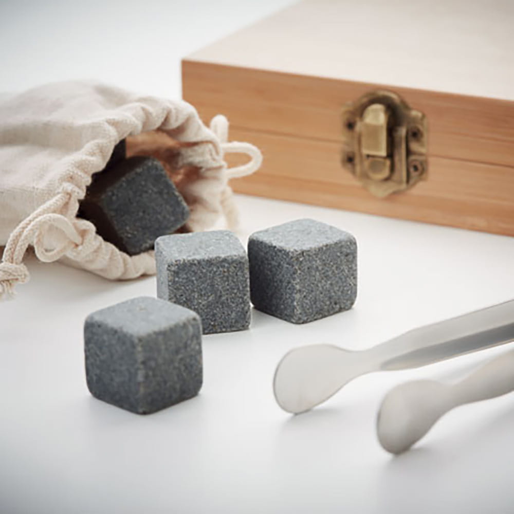 Podaruj swojemu cukiernikowi praktyczny prezent, który przyda mu się podczas relaksu w domowym zaciszu – zestaw kamieni do whisky w bambusowym pudełku z grawerem!