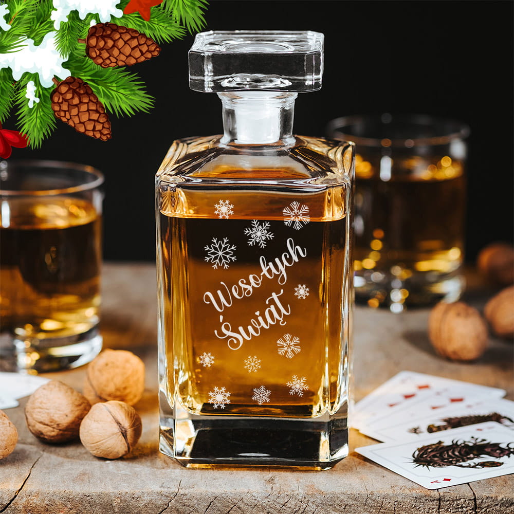 Karafka do Whisky z Grawerem - Prezent na Święta - Wesołych Świąt Śnieżynki - Kwadratowa