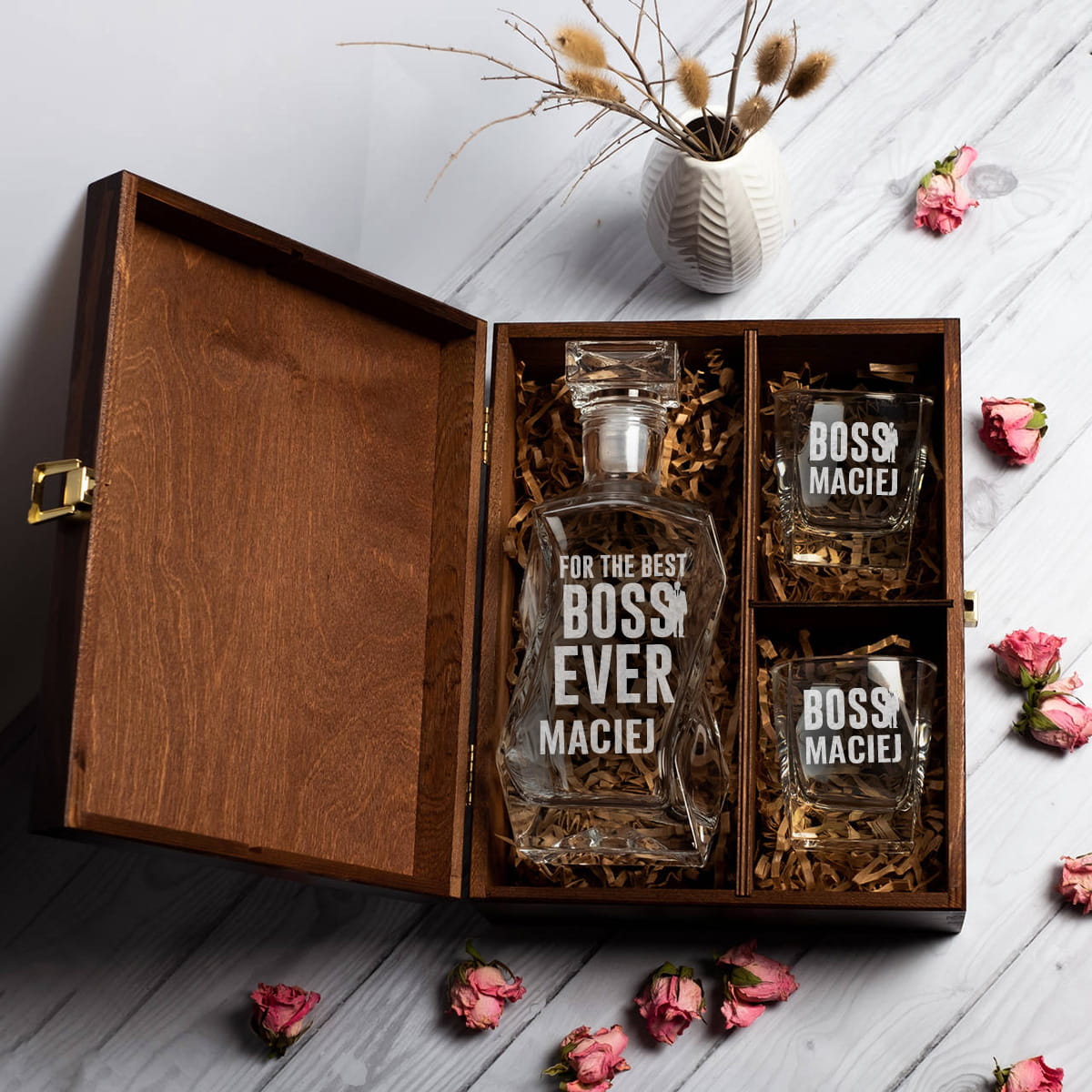 Szukasz eleganckiego prezentu dla szefa na urodziny? Wybierz zestaw składający się z karafki na whisky i szklanek zamkniętych w skrzynce z grawerem.