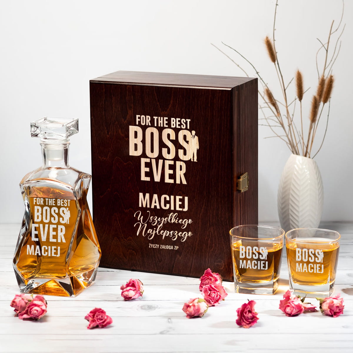 Karafka i Szklanki w Skrzynce z Grawerem - Prezent dla Szefa - For The Best Boss Ever