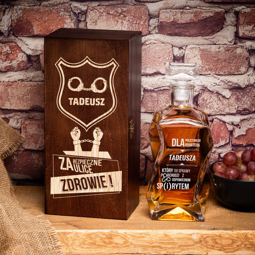Wręcz elegancki prezent Policjantowi – karafkę w skrzynce z grawerem.