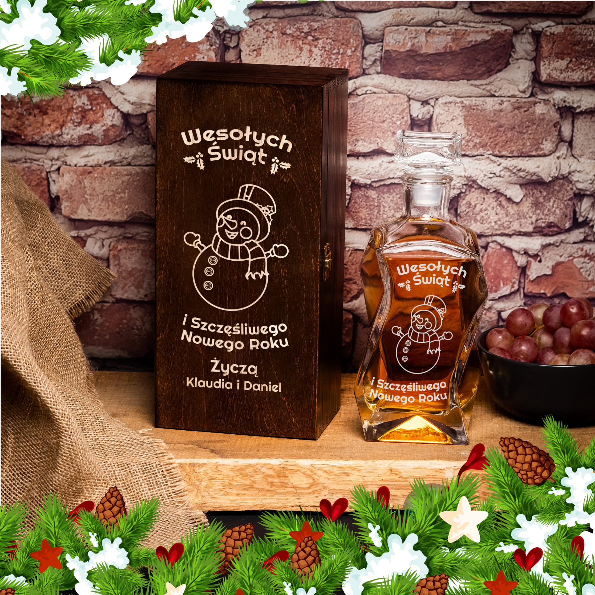 Szukasz eleganckiego prezentu na święta? Polecamy piękną karafkę w skrzynce z grawerem Wesołych Świąt i Szczęśliwego Nowego Roku z bałwankiem.