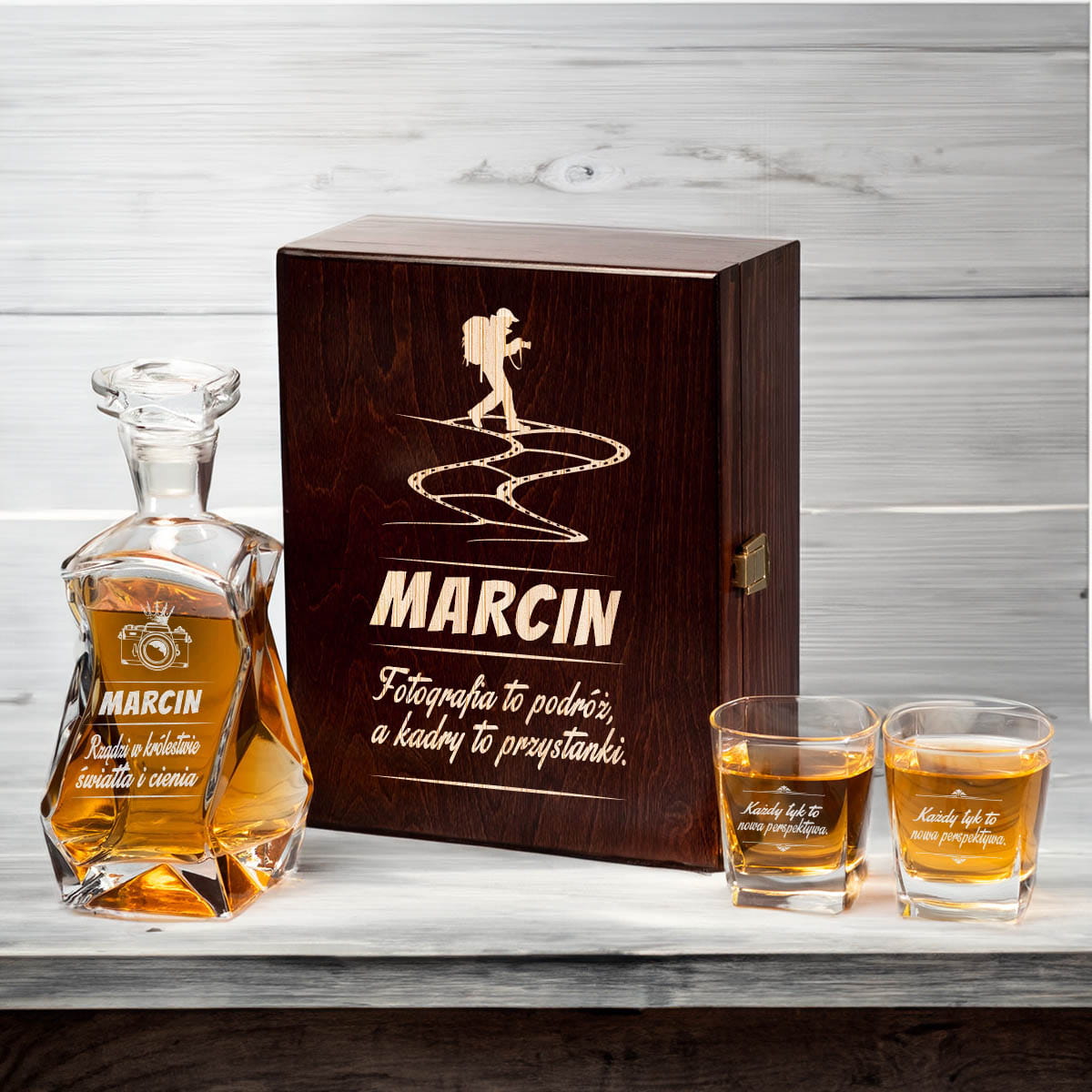 Karafka w Skrzynce z Grawerem i Szklanki do Whisky - Prezent dla Fotografa