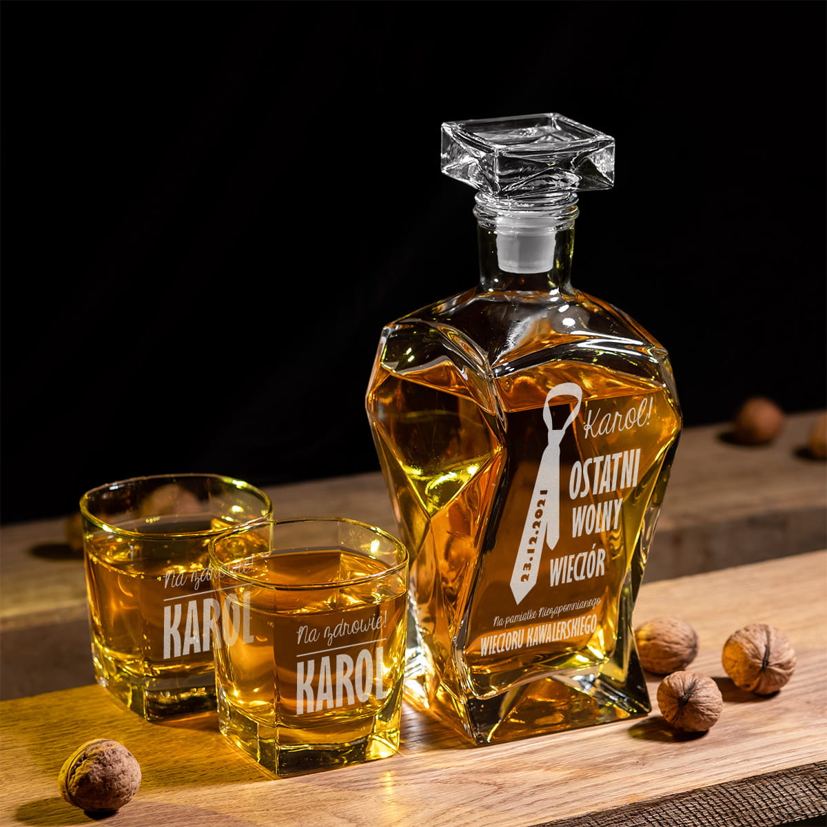 Personalizowana karafka na whisky i zestaw 2 sztuk szklanek z grawerem to świetny prezent na Wieczór Kawalerski dla przyszłego Pana Młodego!