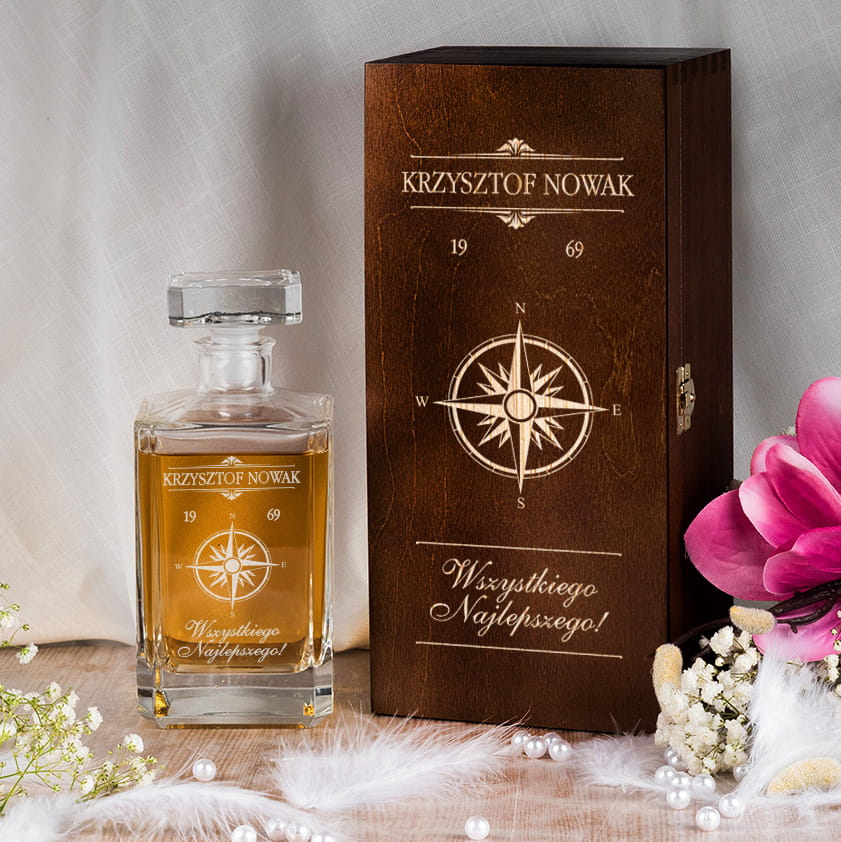 Klasyczna karafka w skrzynce z grawerem to wspaniały prezent dla podróżnika, który możesz wręczyć np. z okazji urodzin.