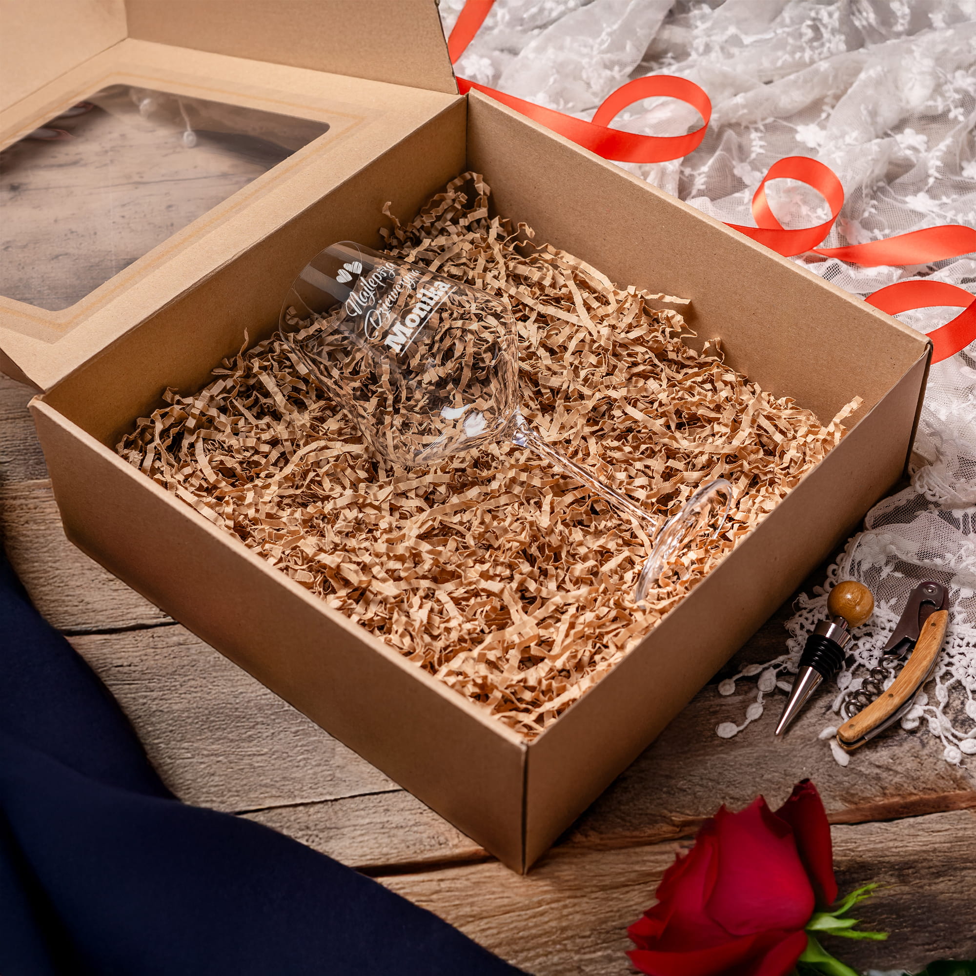 - Wypełnienie z eko wiórków – wnętrze pudełka wypełniamy ekowiórkami, aby kieliszek ładnie się prezentował i był zabezpieczony przed wstrząsami w momencie wręczania prezentu.