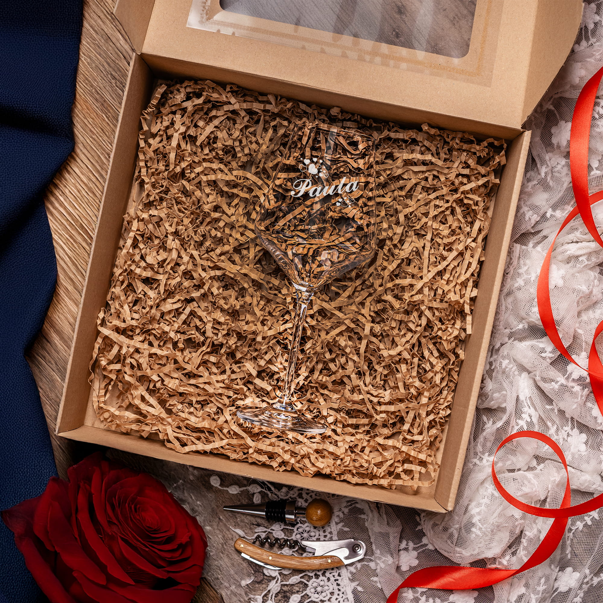 - Wypełnienie z eko wiórków – wnętrze pudełka wypełniamy ekowiórkami, aby kieliszek ładnie się prezentował i był zabezpieczony przed wstrząsami w momencie wręczania prezentu.