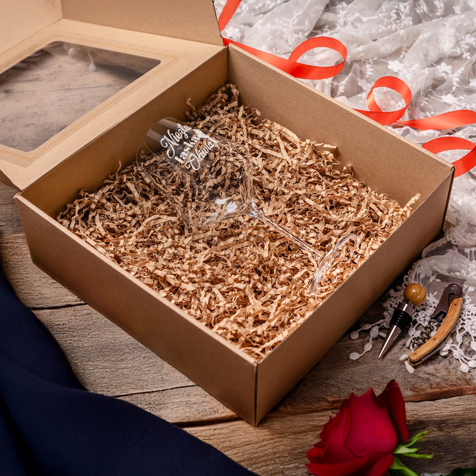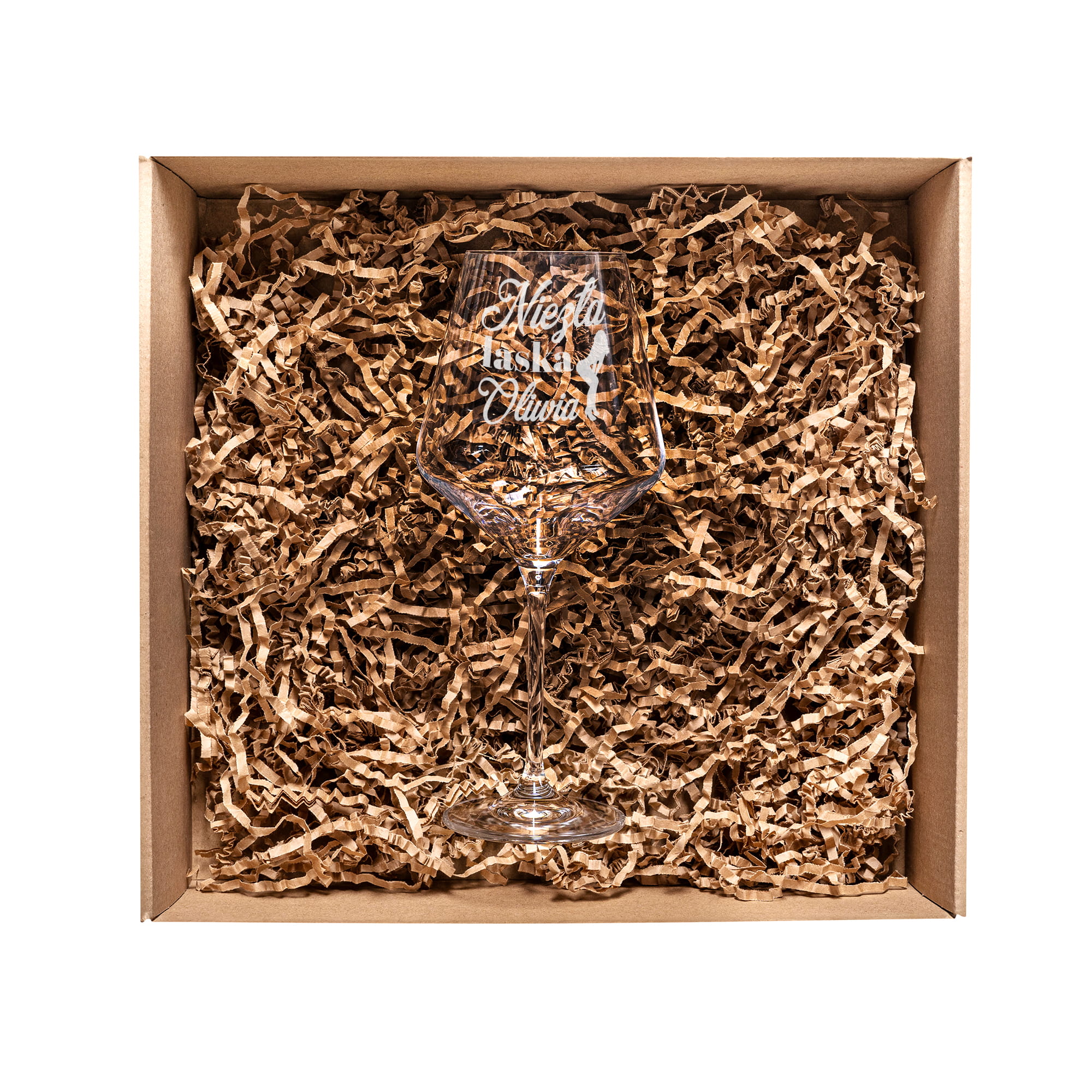 - Wypełnienie z eko wiórków – wnętrze pudełka wypełniamy ekowiórkami, aby kieliszek ładnie się prezentował i był zabezpieczony przed wstrząsami w momencie wręczania prezentu.