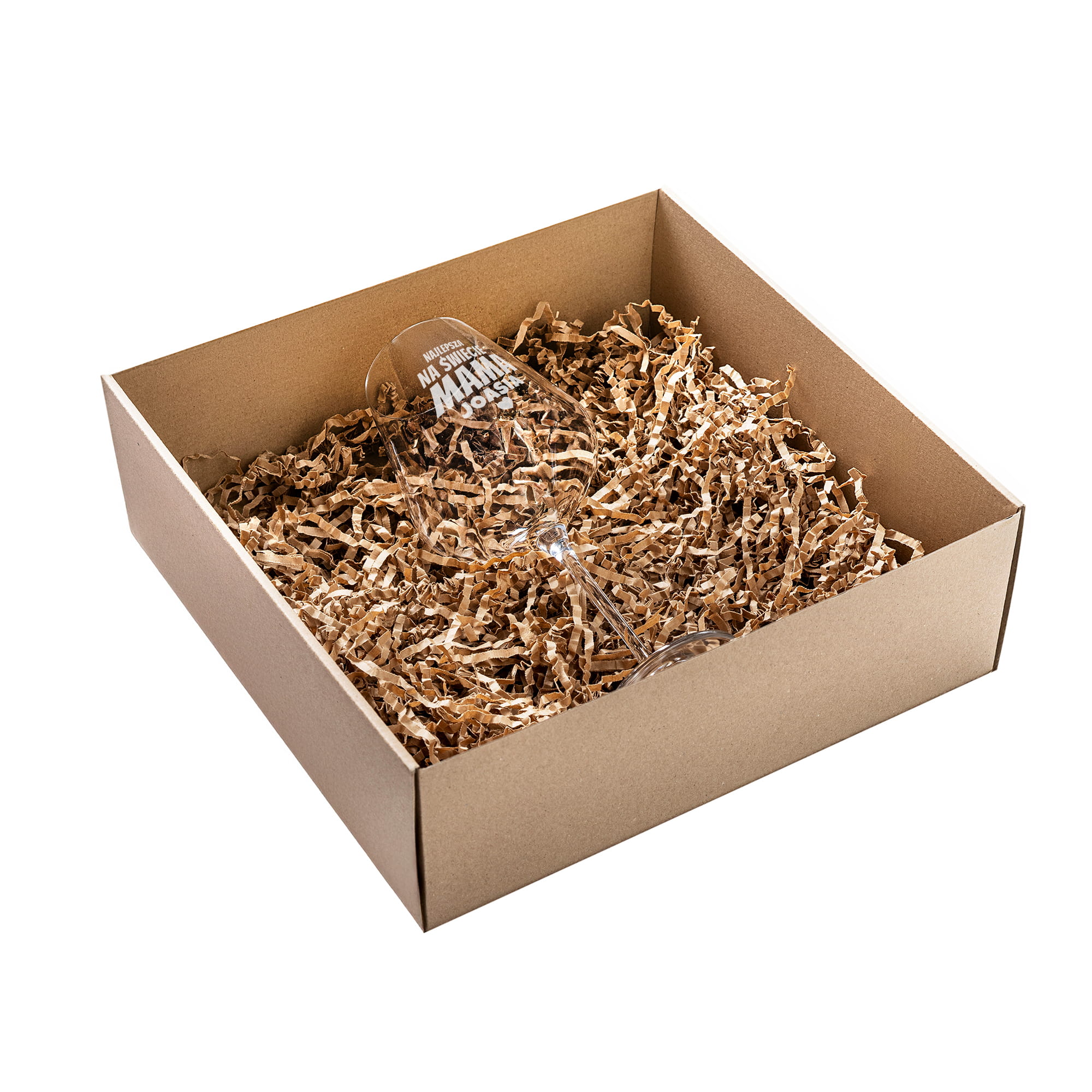 • Wypełnienie z eko wiórków  – wnętrze pudełka wypełniamy ekowiórkami, aby kieliszek ładnie się prezentował i był zabezpieczony przed wstrząsami w momencie wręczania prezentu.