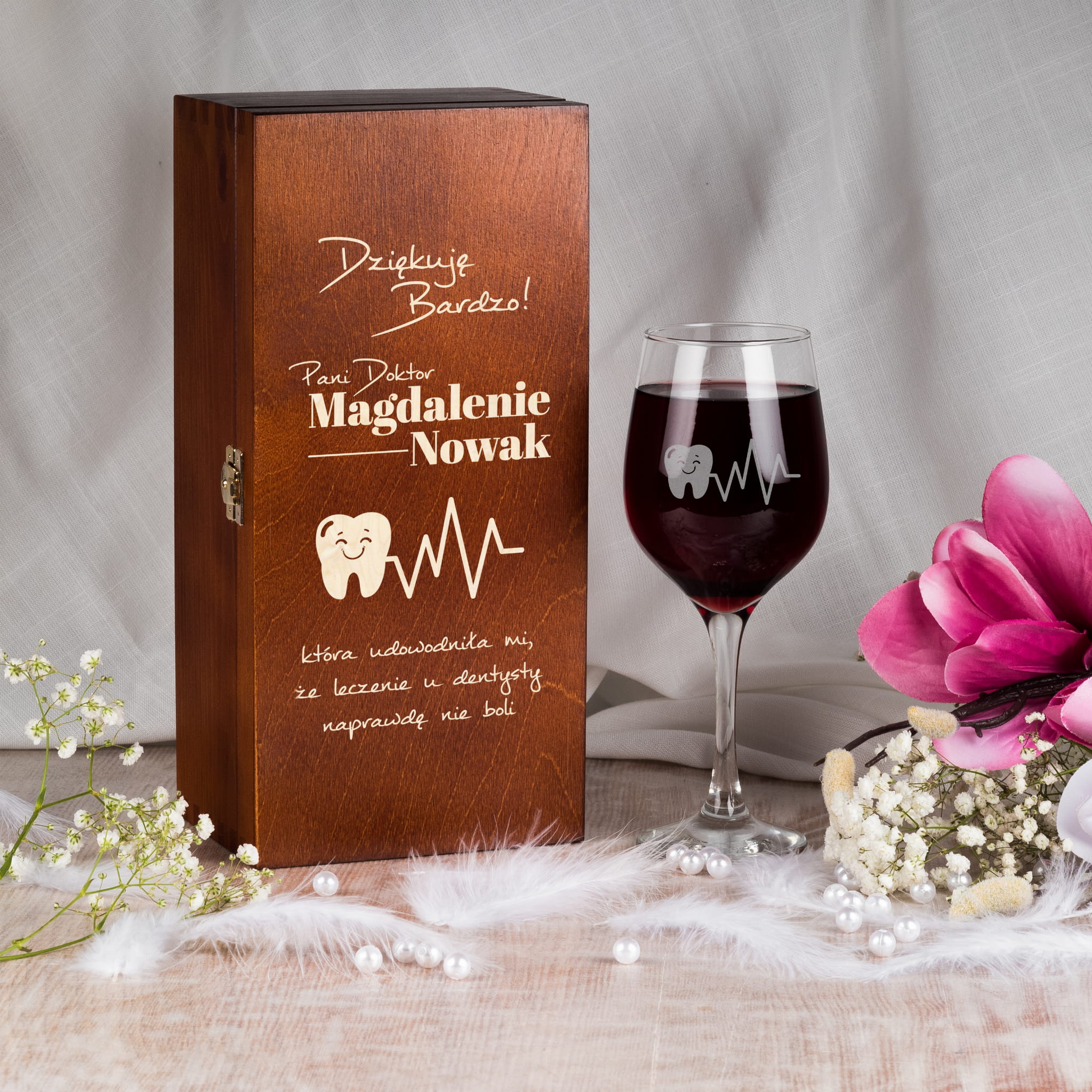 Kieliszek do Wina w Skrzynce z Grawerem - Prezent dla Dentysty - Prezent dla Pani Stomatolog - Dziękuję Pani Doktor