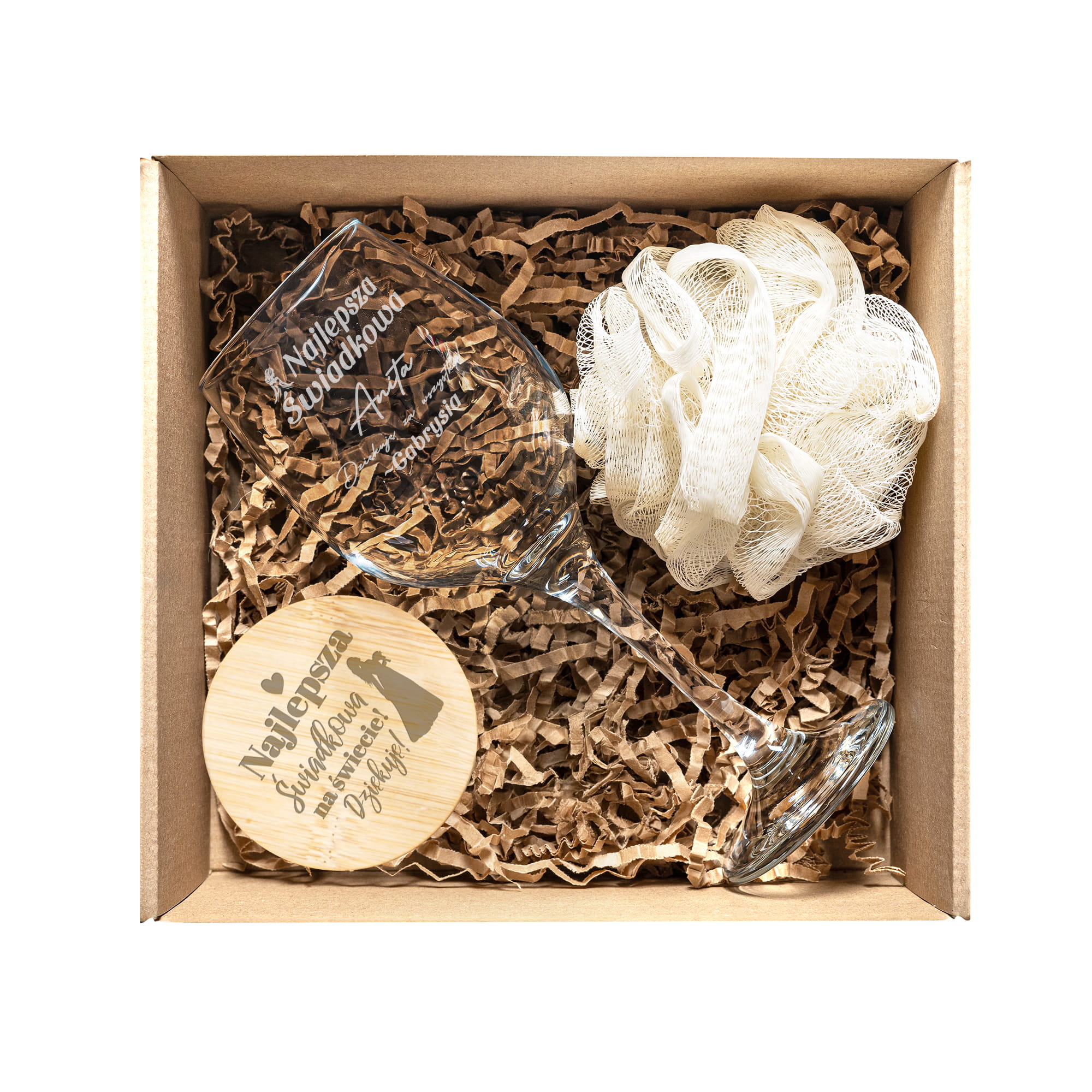 Kieliszek do Wina z Grawerem - Podziękowanie dla Świadkowej - Zestaw Prezentowy Box dla Świadkowej - Kieliszek + Lusterko Bambusowe + Myjka do Kąpieli - Najlepsza Świadkowa Dziękuję
