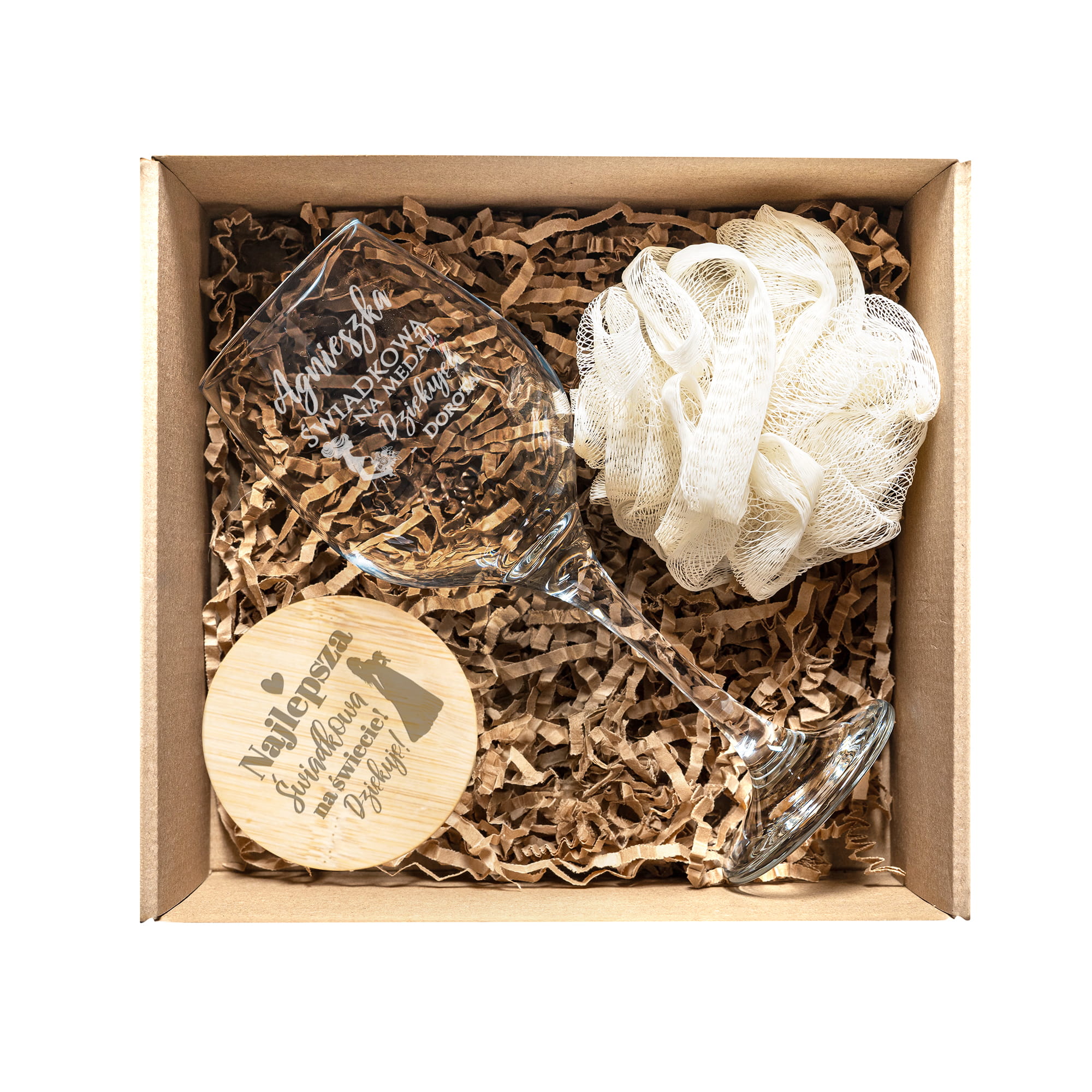 Kieliszek do Wina z Grawerem - Podziękowanie dla Świadkowej - Zestaw Prezentowy Box dla Świadkowej - Kieliszek + Lusterko Bambusowe + Myjka do Kąpieli - Świadkowa na Medal