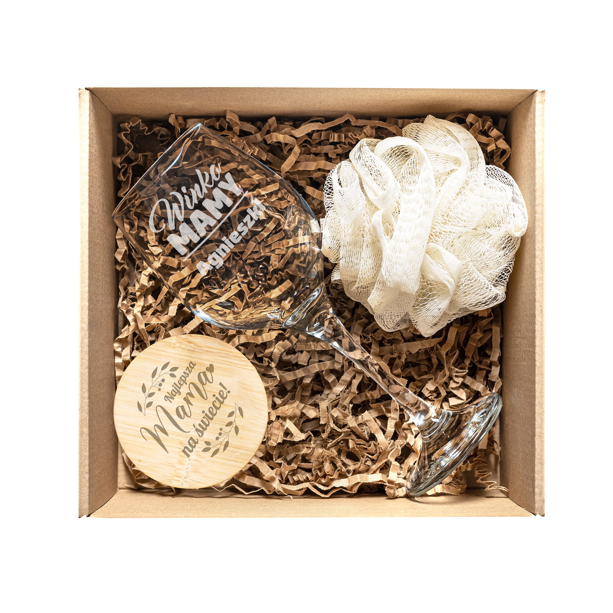 Kieliszek do Wina z Grawerem - Prezent dla Mamy - Zestaw Prezentowy na Dzień Matki - Kieliszek + Lusterko Bambusowe + Myjka do Kąpieli - Winko Mamy