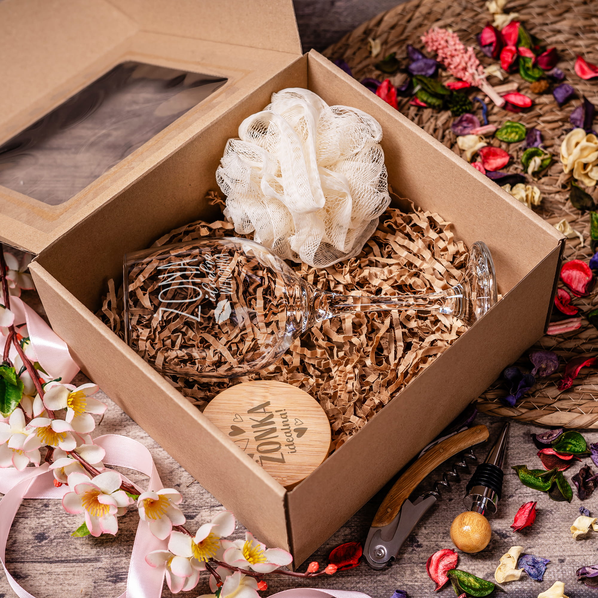 - Zestaw jest gotowy do wręczenia i zapakowany w eleganckie pudełko z okienkiem. Wnętrze pudełka wypełniamy ekowiórkami.