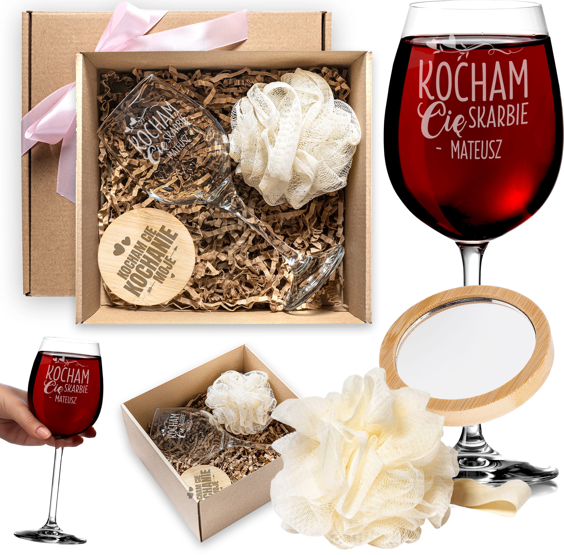 Kieliszek do Wina z Grawerem - Prezent na Walentynki dla Niej - Zestaw Prezentowy na Walentynki - Kieliszek + Lusterko Bambusowe + Myjka do Kąpieli - Kocham Cię Skarbie
