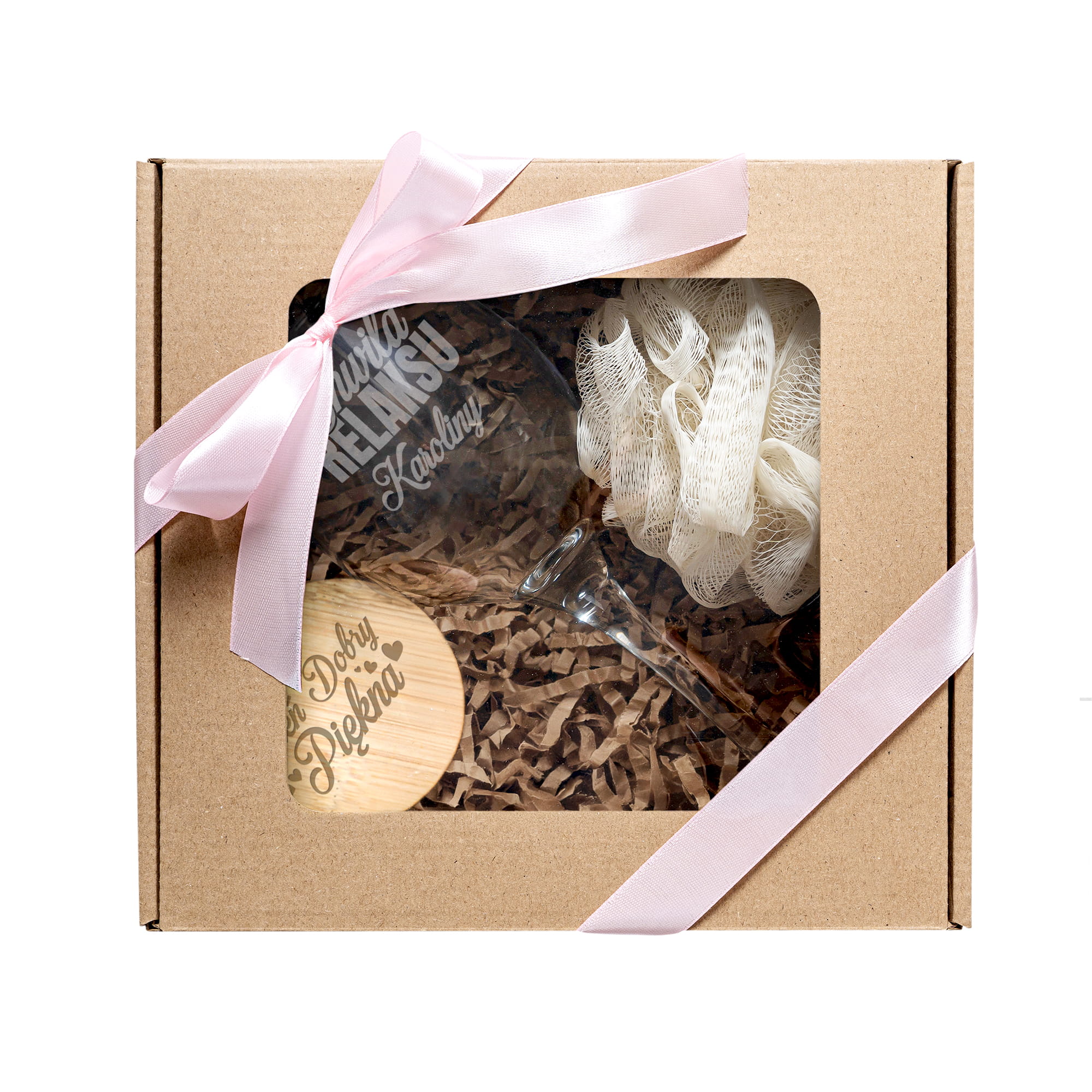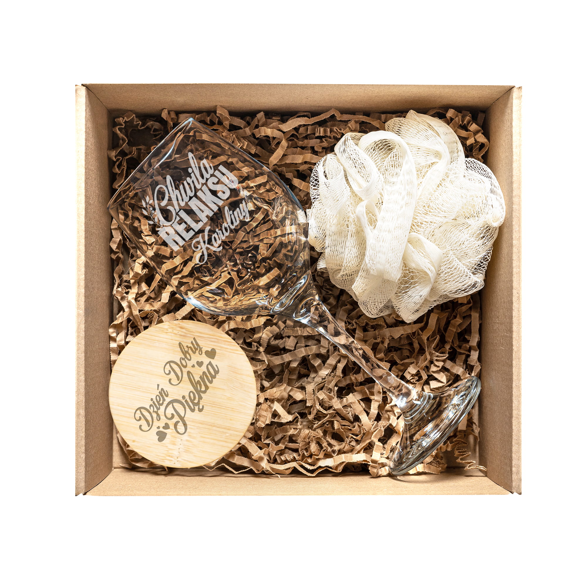 Kieliszek do Wina z Grawerem - Prezent z Imieniem - Zestaw Prezentowy dla Niej - Kieliszek + Lusterko Bambusowe + Myjka do Kąpieli - Chwila Relaksu