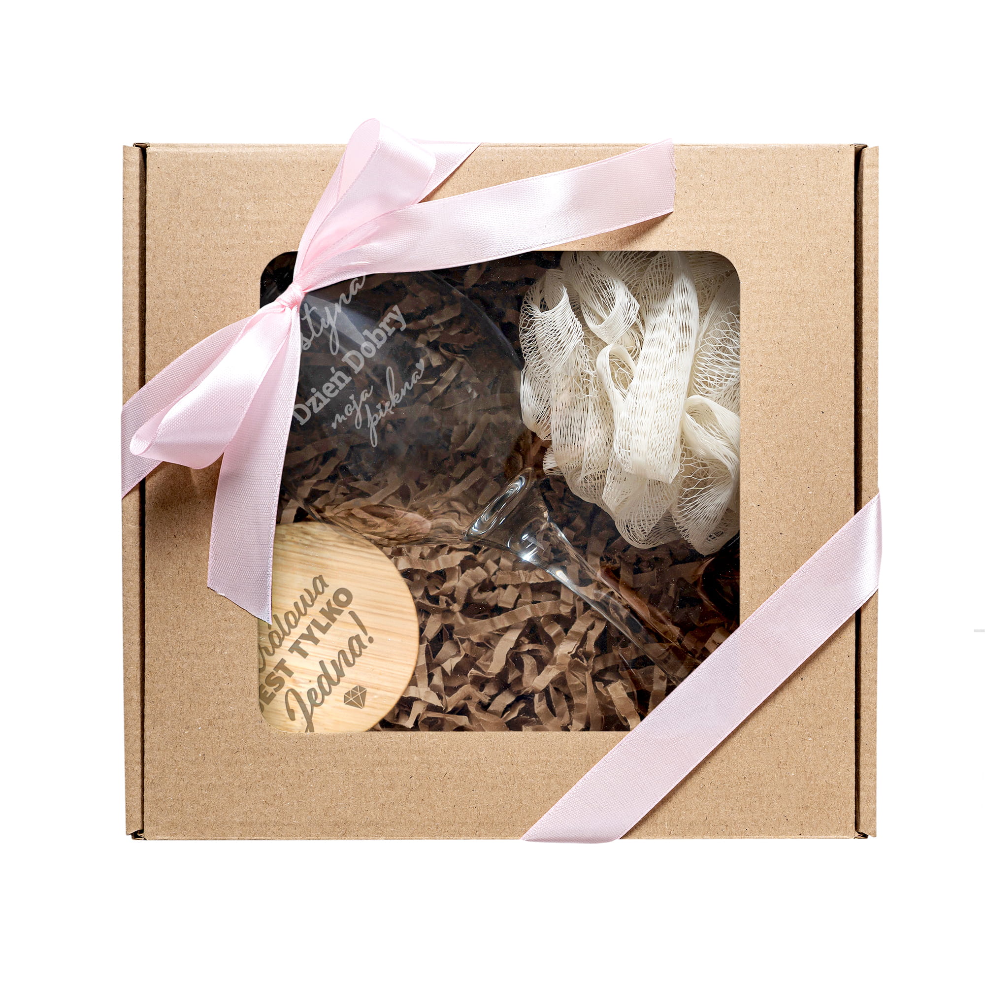 - Zestaw jest gotowy do wręczenia i zapakowany w eleganckie pudełko z okienkiem. Wnętrze pudełka wypełniamy ekowiórkami.