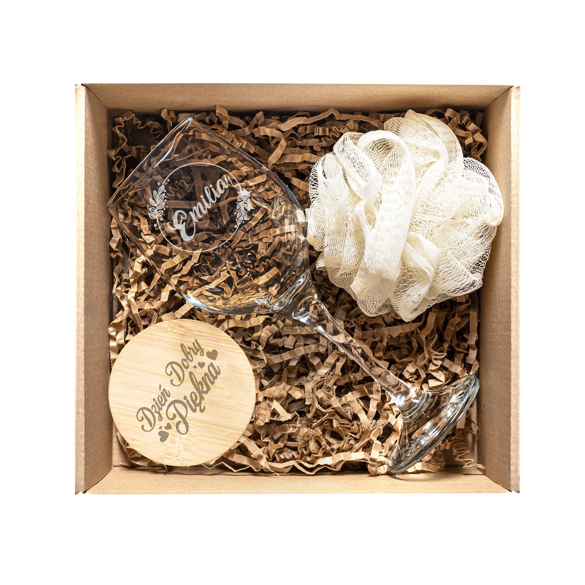 Kieliszek do Wina z Grawerem - Prezent z Imieniem - Zestaw Prezentowy dla Niej - Kieliszek + Lusterko Bambusowe + Myjka do Kąpieli - Imię Koło z Listkami