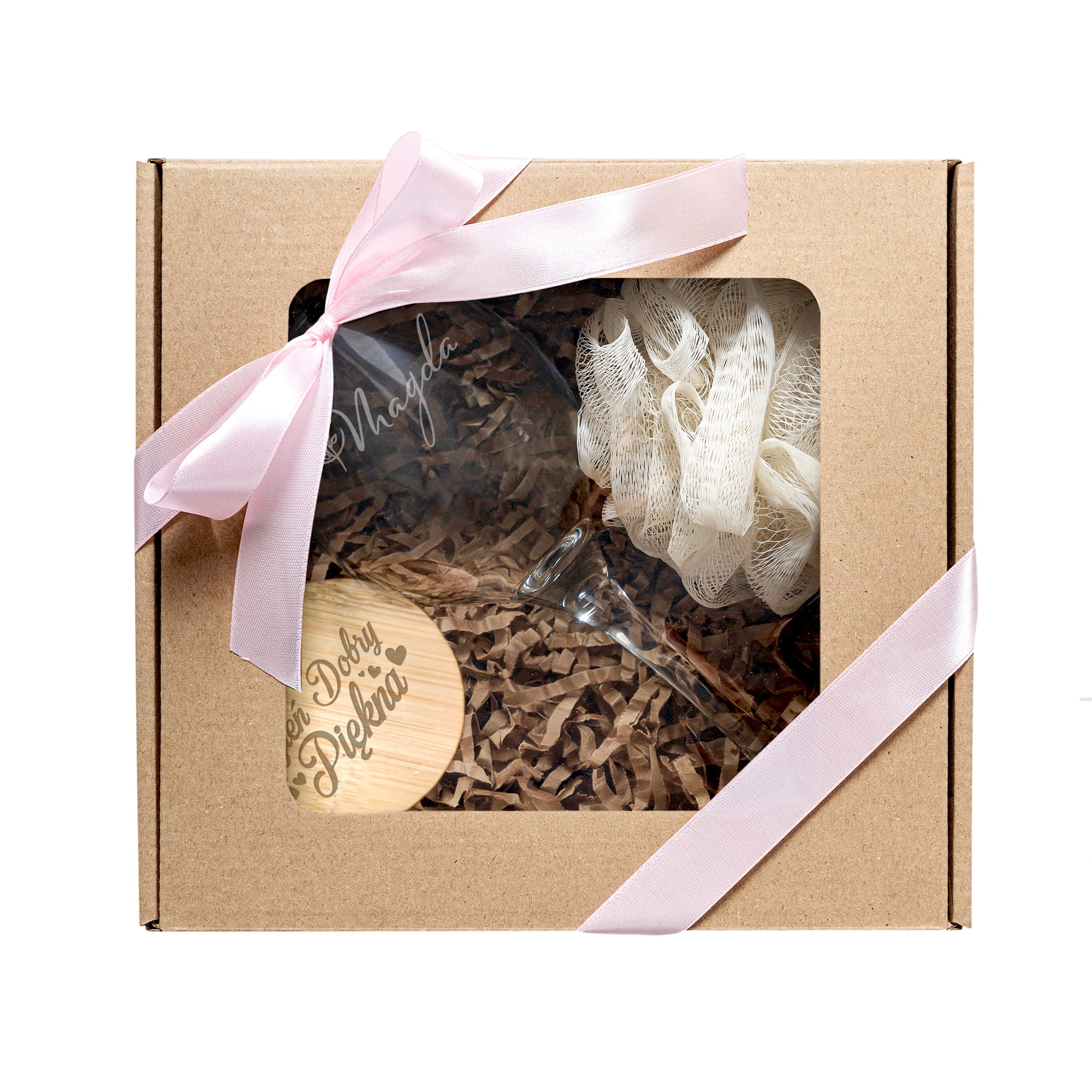 Kieliszek do Wina z Grawerem - Prezent z Imieniem - Zestaw Prezentowy dla Niej - Kieliszek + Lusterko Bambusowe + Myjka do Kąpieli - Imię Subtelny Liść