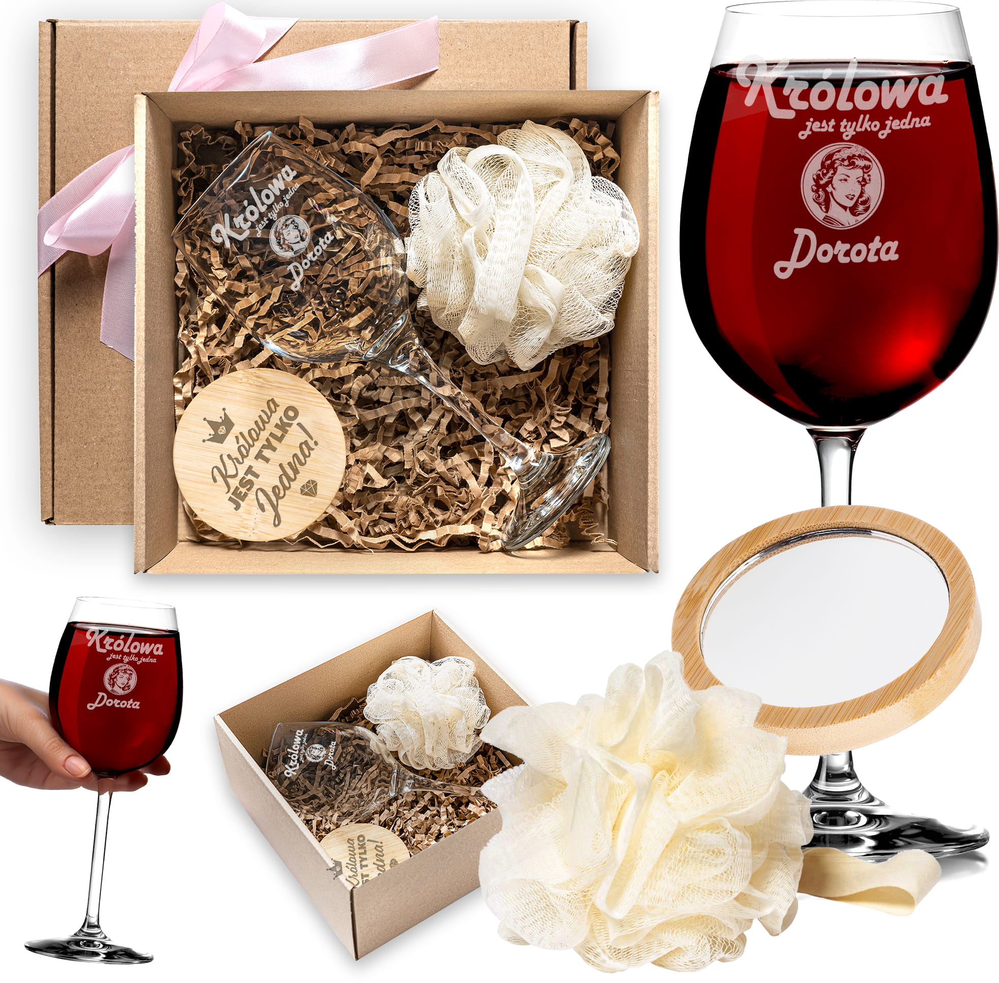 Kieliszek do Wina z Grawerem - Prezent z Imieniem - Zestaw Prezentowy dla Niej - Kieliszek + Lusterko Bambusowe + Myjka do Kąpieli - Królowa Jest Tylko Jedna