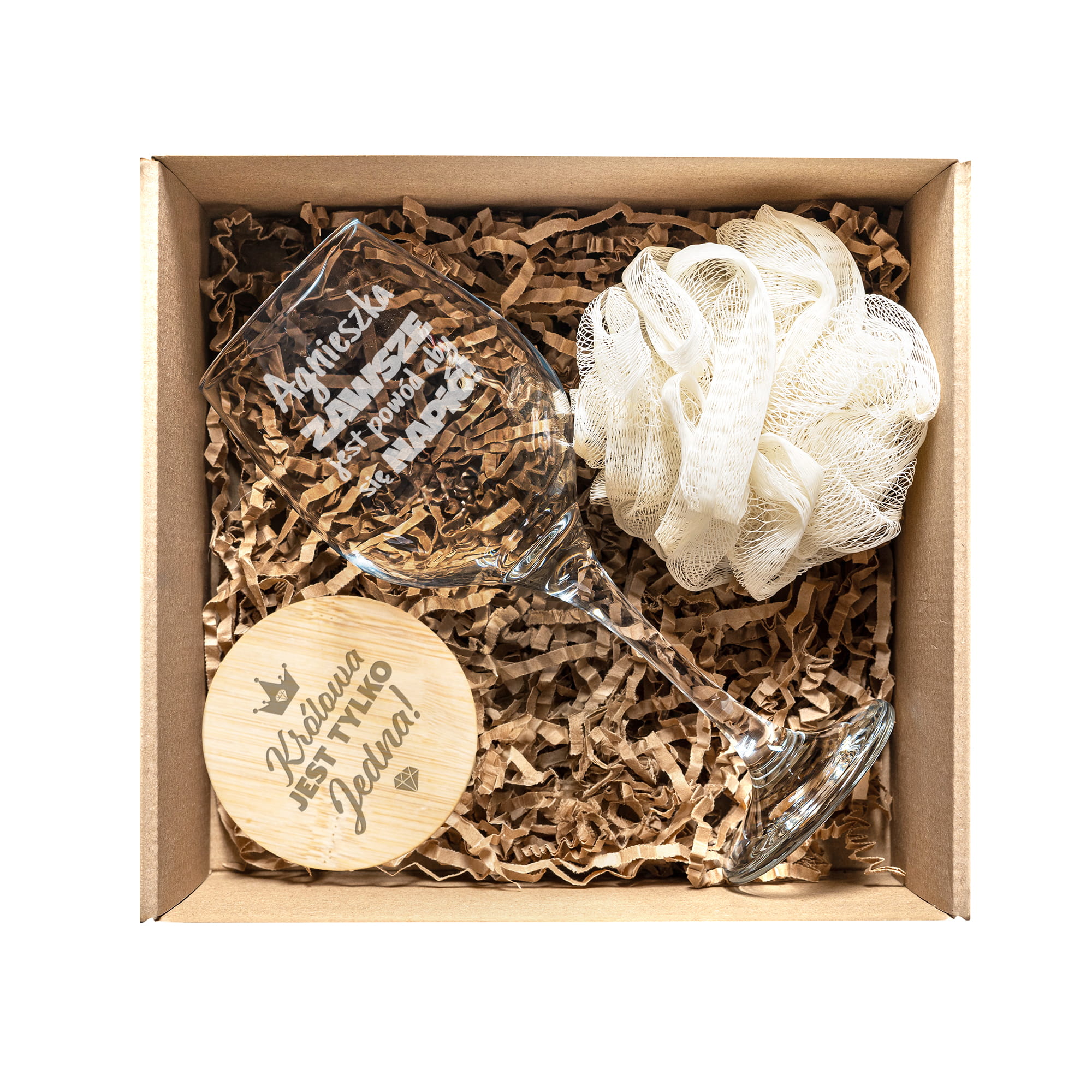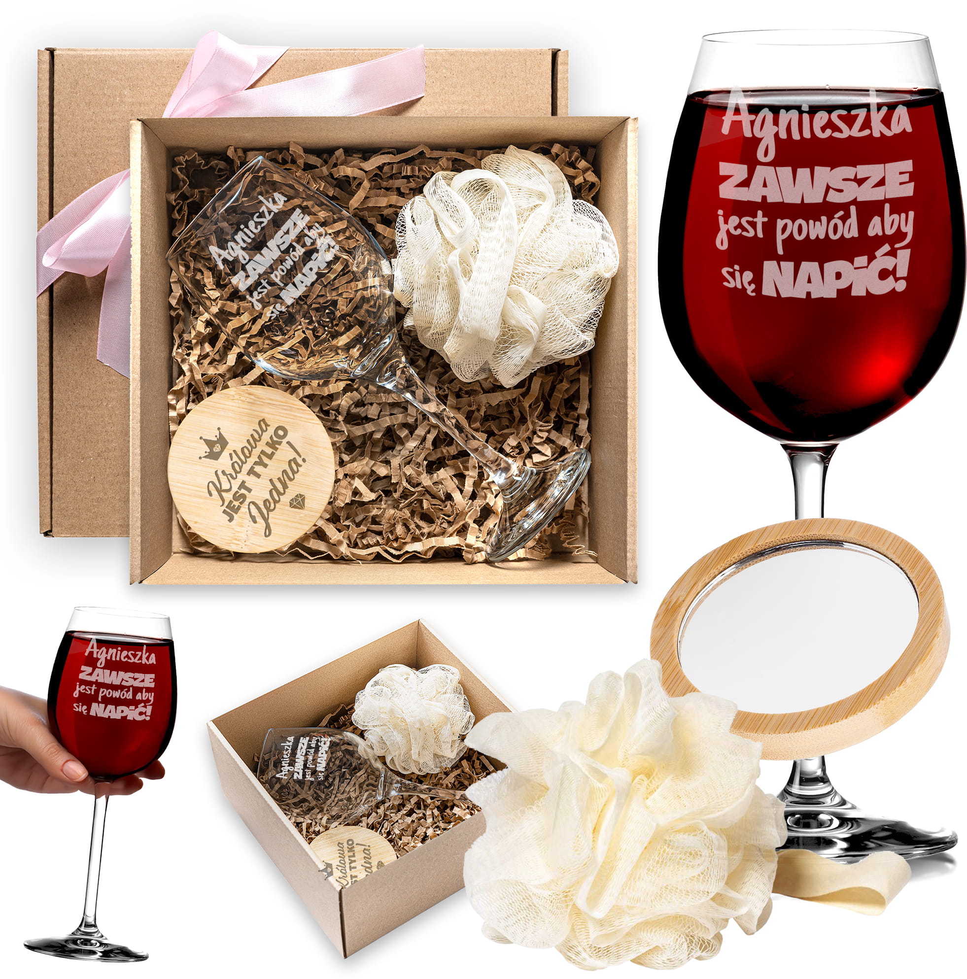 Kieliszek do Wina z Grawerem - Prezent z Imieniem - Zestaw Prezentowy dla Niej - Kieliszek + Lusterko Bambusowe + Myjka do Kąpieli - Zawsze Jest Powód