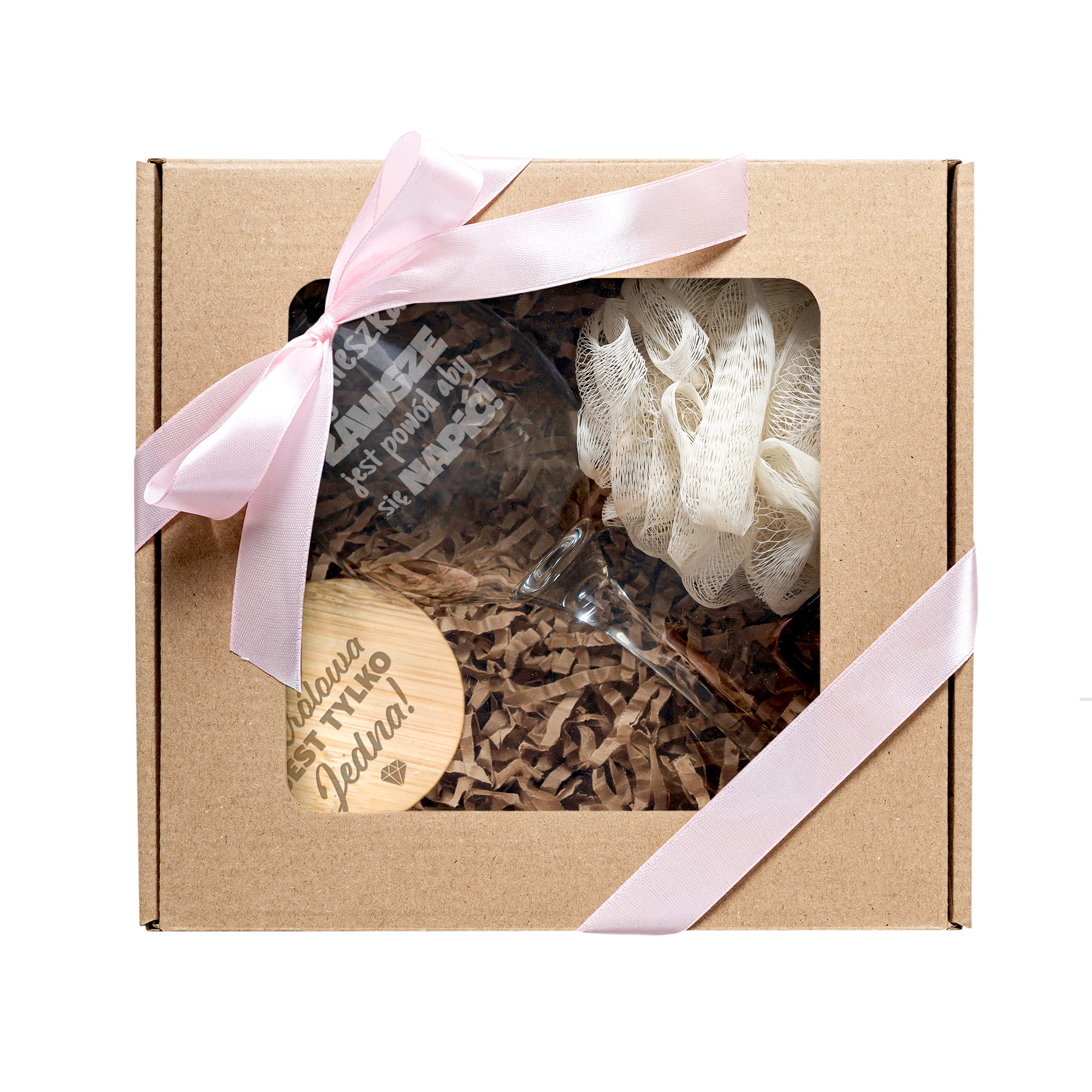 - Zestaw jest gotowy do wręczenia i zapakowany w eleganckie pudełko z okienkiem. Wnętrze pudełka wypełniamy ekowiórkami.