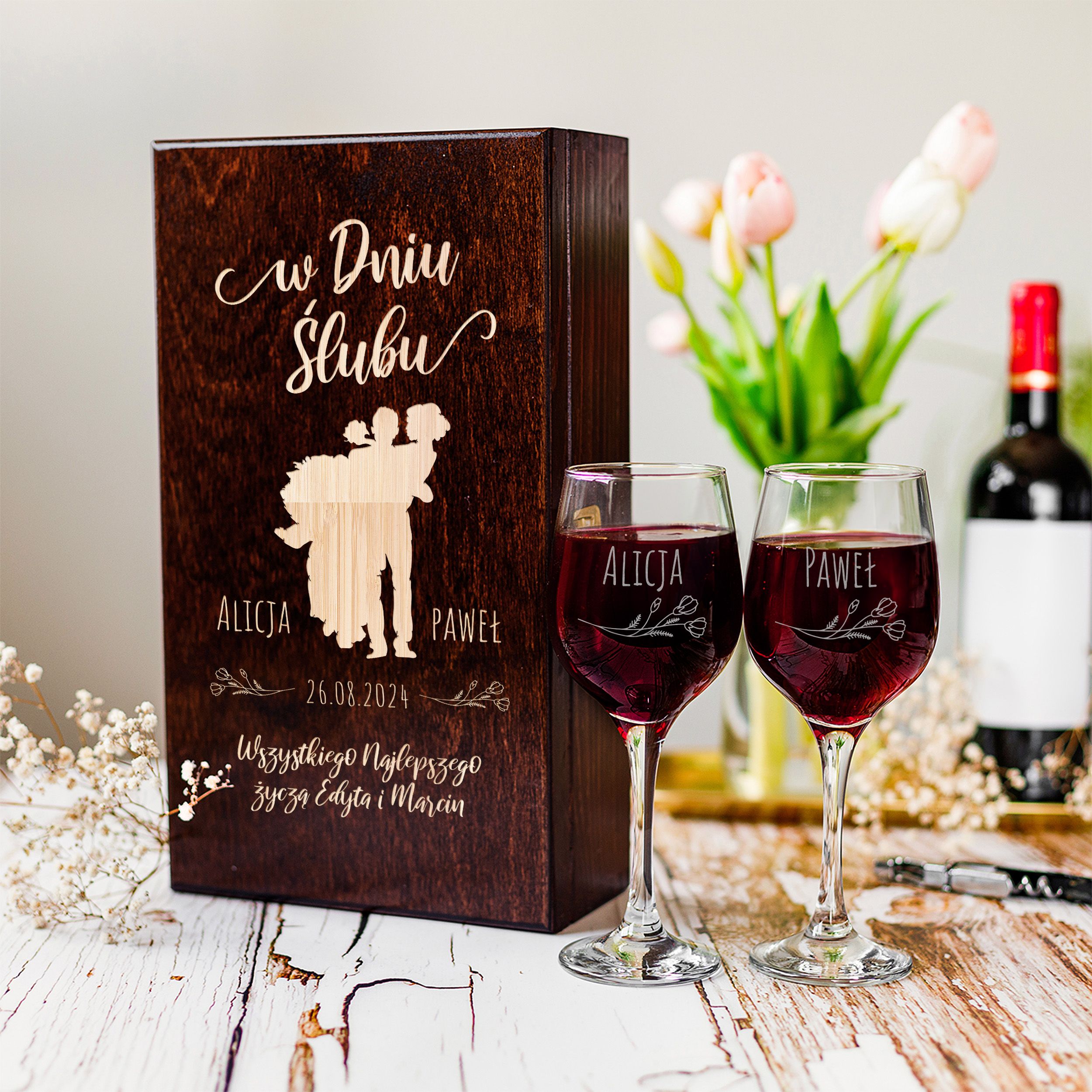 Skrzynka oraz kieliszki będą pamiątką ślubu i staną na honorowym miejscu w domu albo mieszkaniu. Zestaw dwóch personalizowanych kieliszków na wino to doskonały prezent na ślub dla koneserów wina. Elegancka skrzynka wykonana jest z drewna najwyższej jakości.