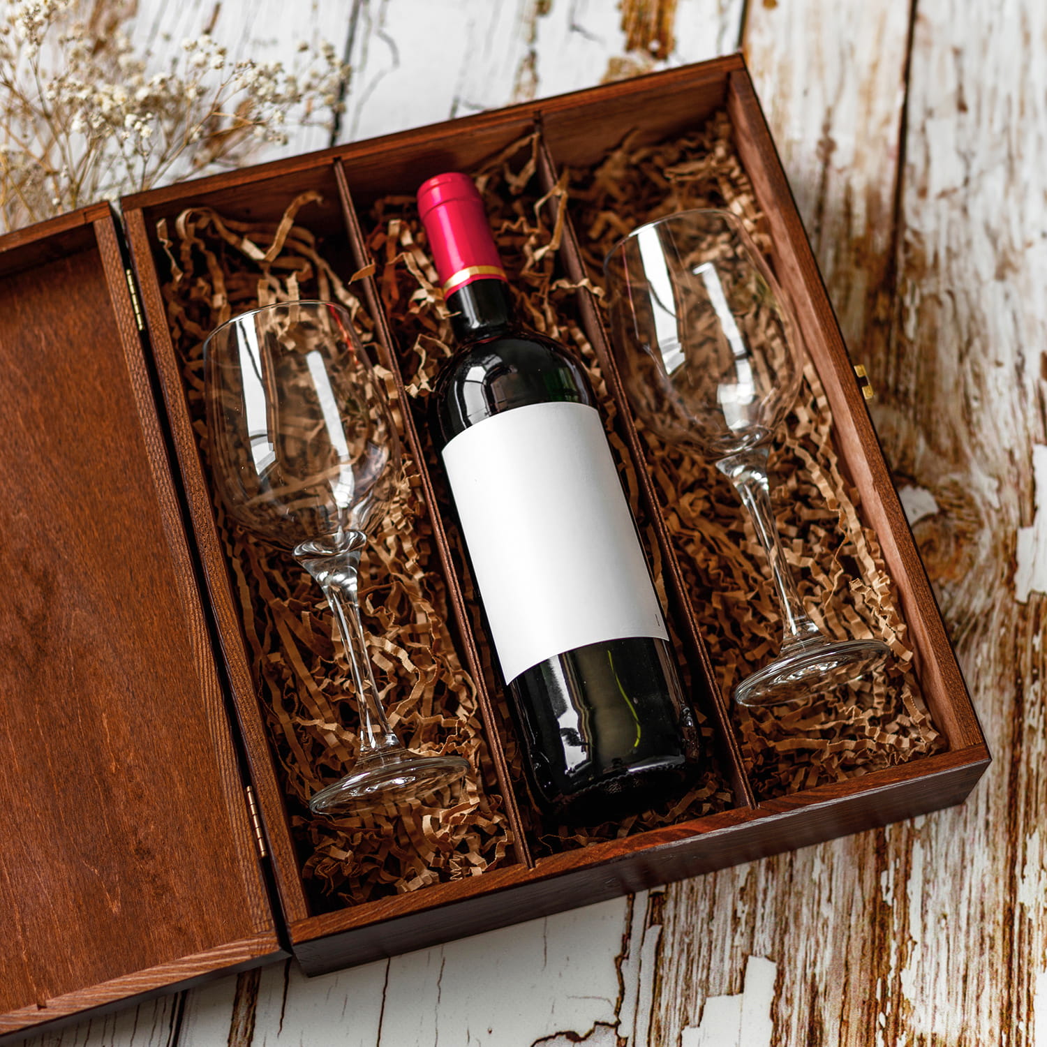 Wypełnienie z wiórków papierowych zabezpiecza kieliszki na wino przed uszkodzeniem. Dzięki metalowemu zamknięciu na boku skrzynki jej zawartość jest bezpiecznie przechowywana. Wyjątkowy grawer jest ozdobą skrzynki i pięknie odznacza się na bejcowanym drewnie.