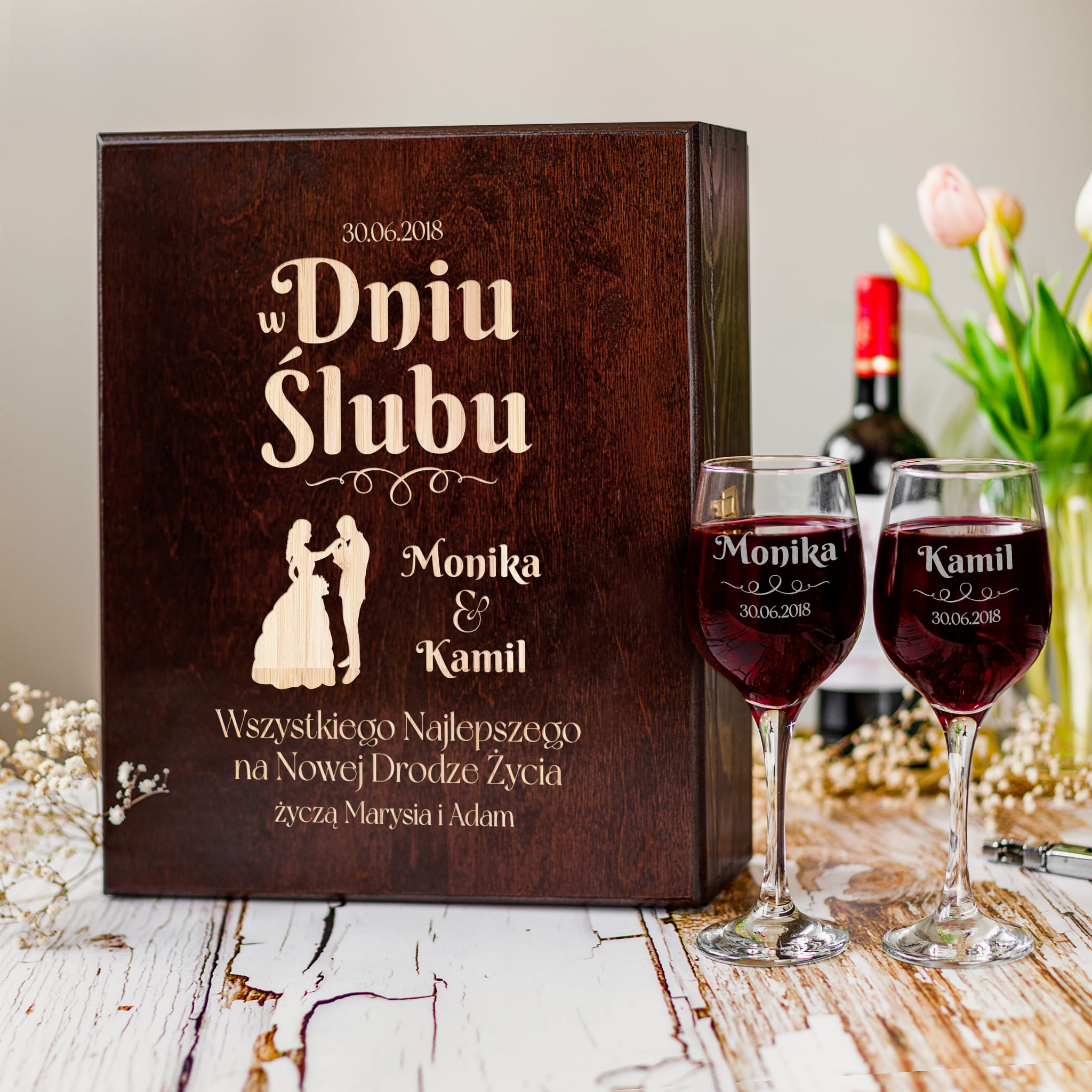 Skrzynka oraz kieliszki będą pamiątką ślubu i staną na honorowym miejscu w domu albo mieszkaniu. Zestaw dwóch personalizowanych kieliszków na wino to doskonały prezent na ślub dla koneserów wina. Elegancka skrzynka wykonana jest z drewna najwyższej jakości.
