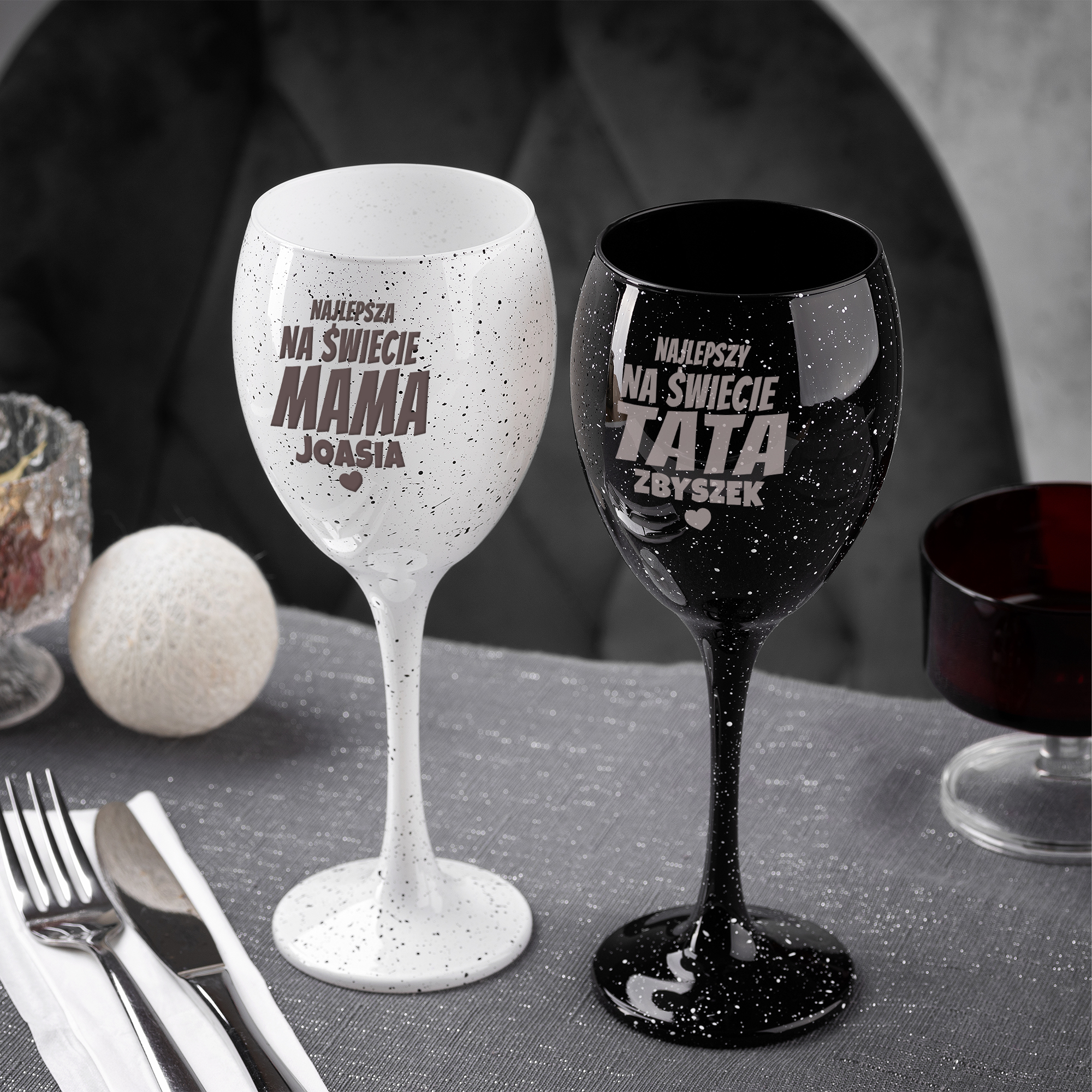Kieliszki do Wina z Grawerem - Prezent dla Mamy i Taty - Kieliszek Biały i Czarny - Zestaw Prezentowy dla Rodziców - Serce