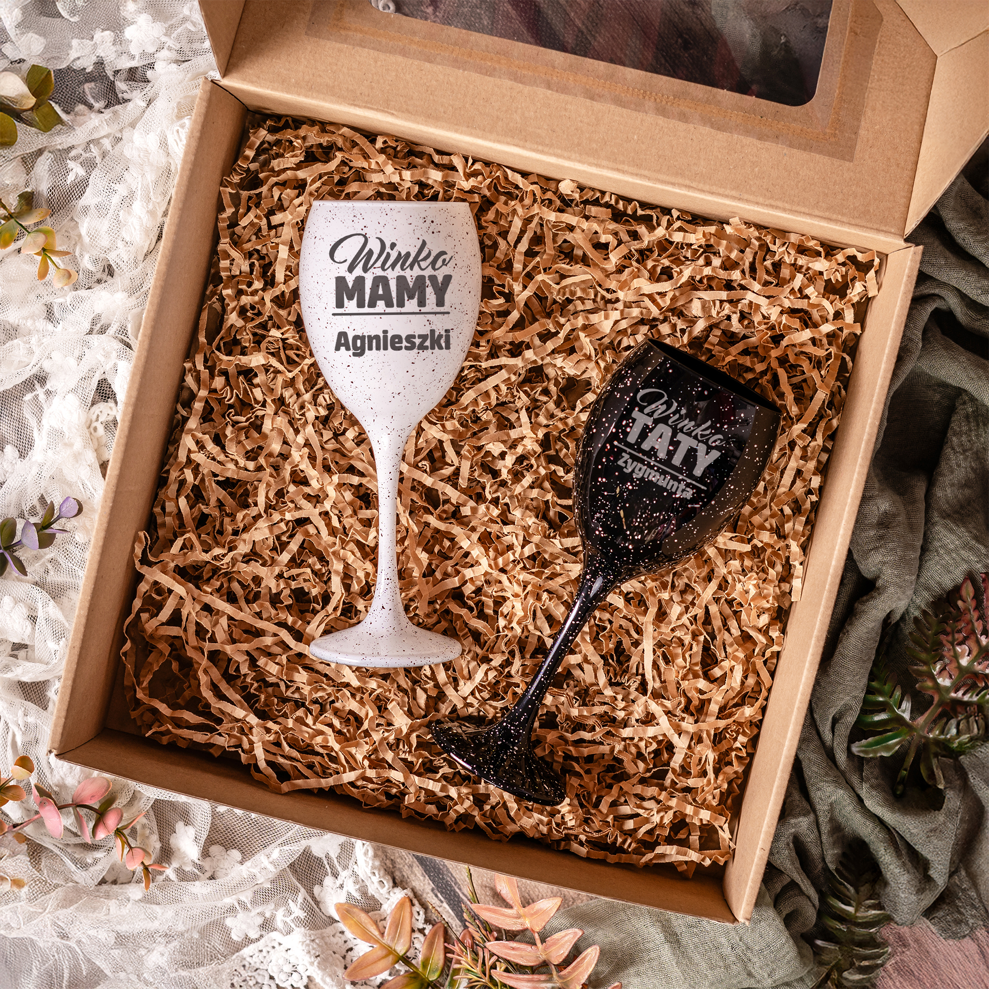 KIELISZKI DO WINA PERSONALIZOWANE Z GRAWEREM IMIONA PREZENT DLA RODZICÓW ZESTAW