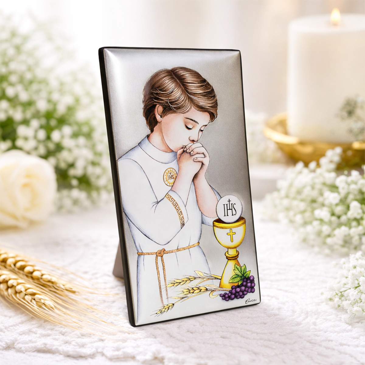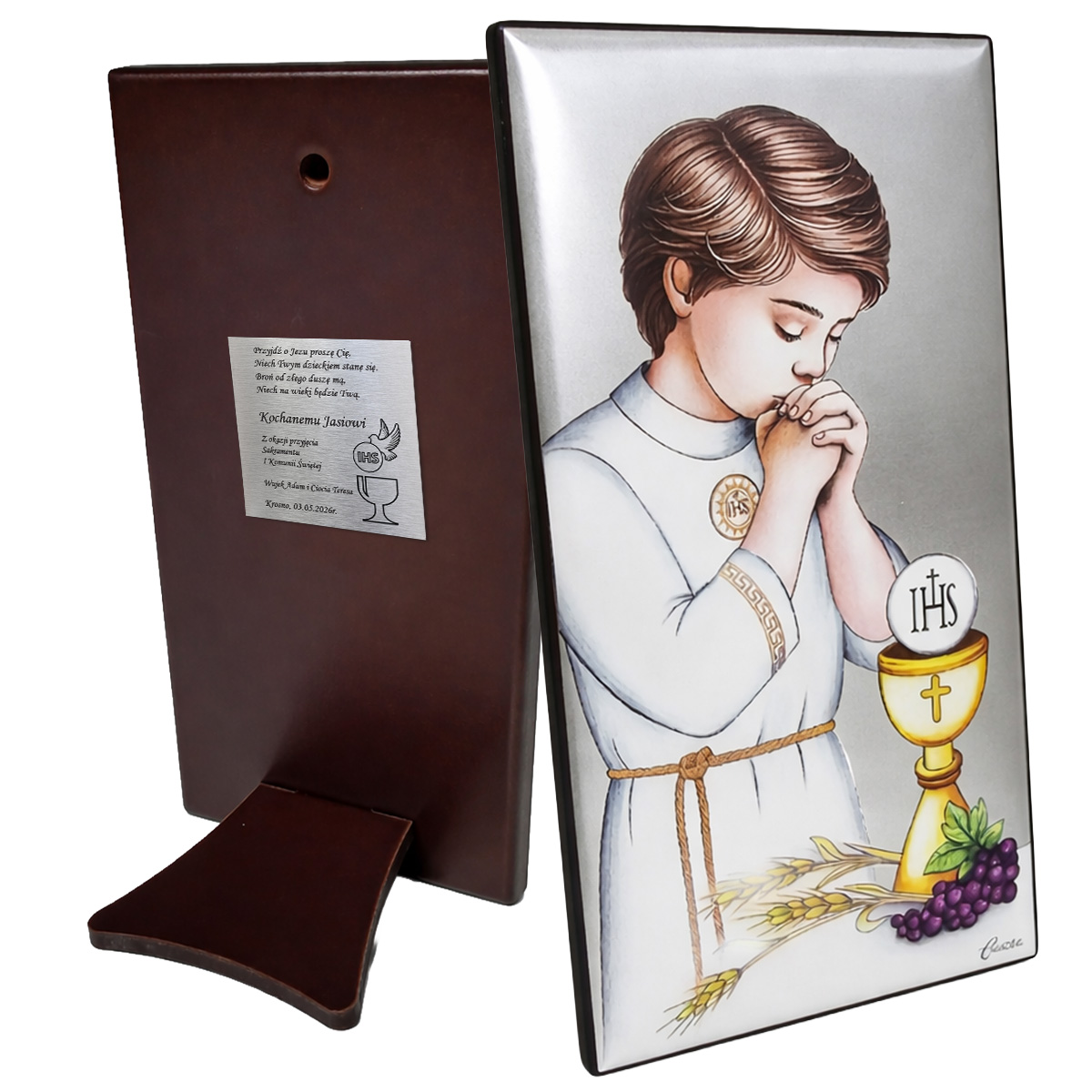 Kolorowy obrazek na drewnianej podstawie z modlącym się chłopcem - elegancka pamiątka Pierwszej Komunii Świętej.