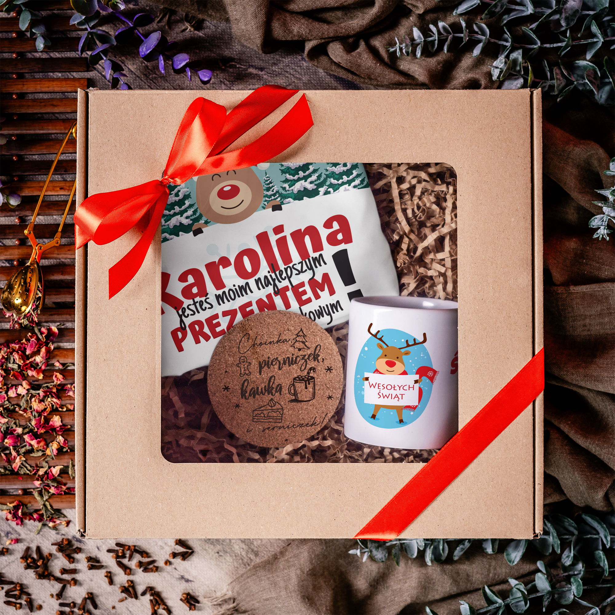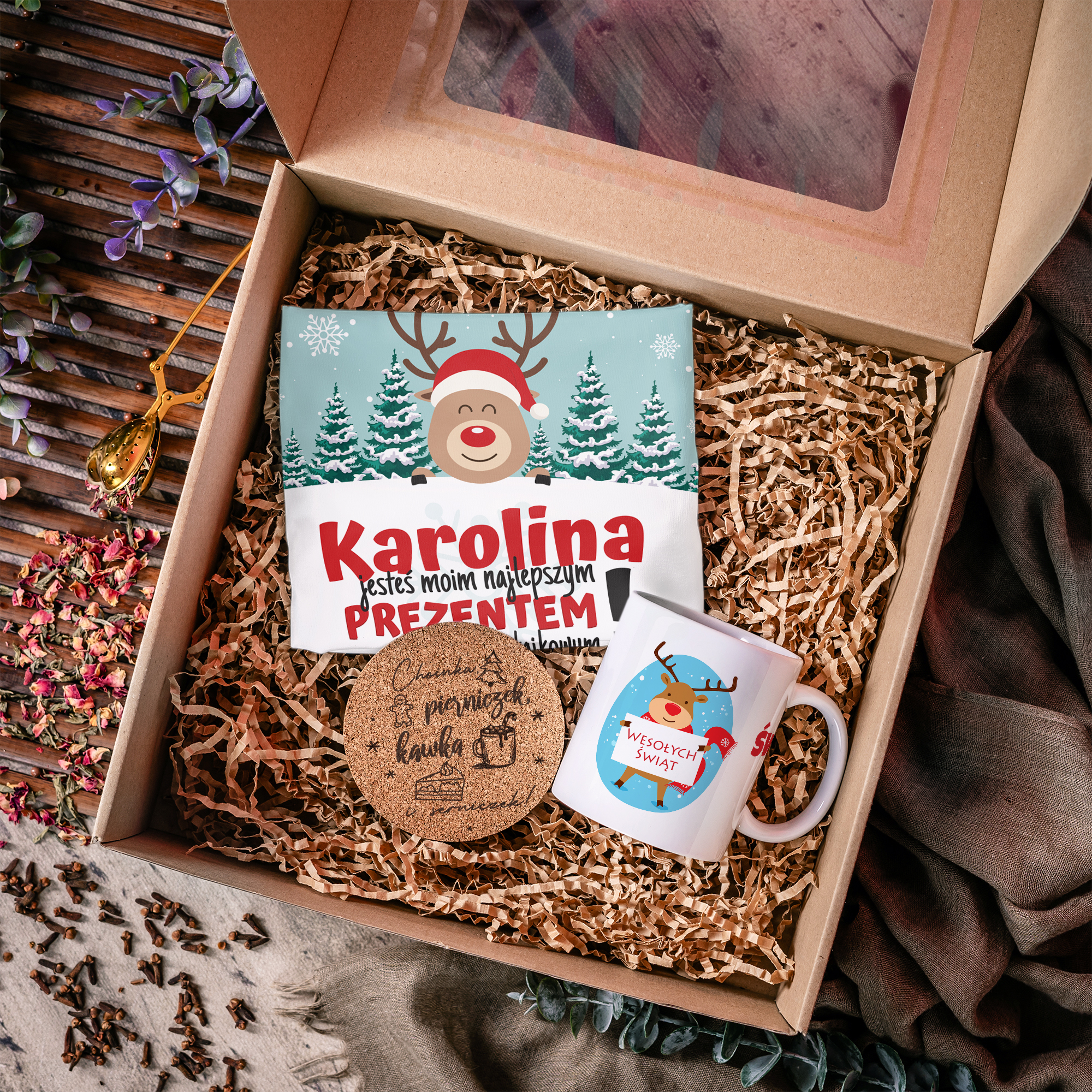 KUBEK Z NADRUKIEM I POSZEWKA NA PODUSZKĘ Z NADRUKIEM - Wyjątkowy świąteczny zestaw prezentowy!