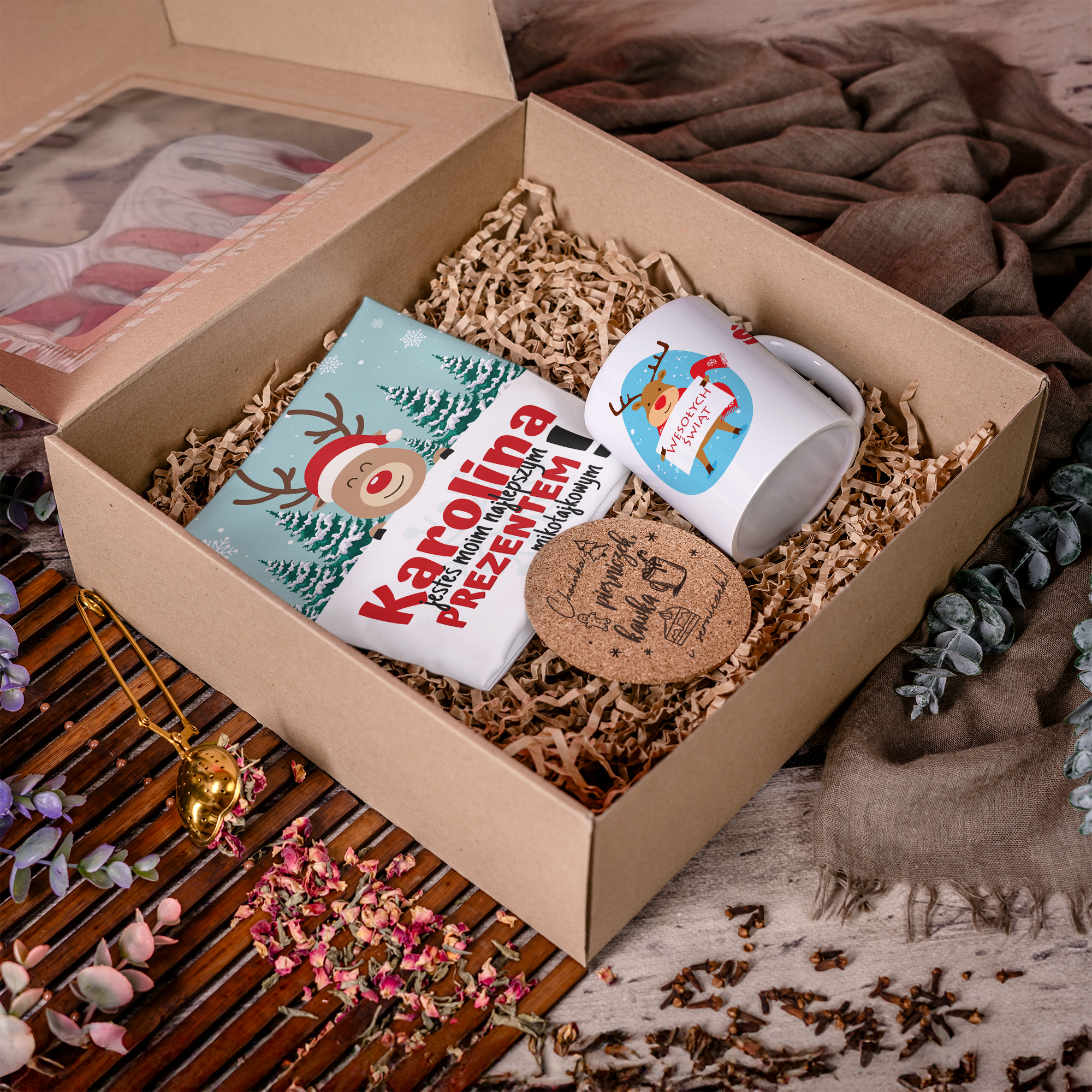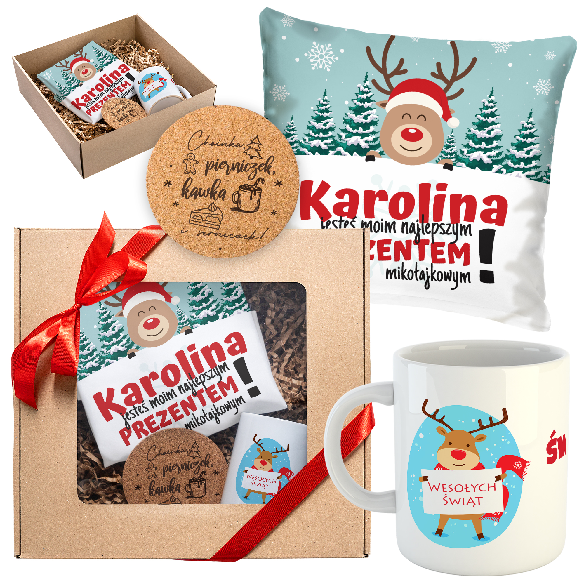 Kubek, Podkładka i Poszewka z Nadrukiem na Mikołaja - Prezent na Święta, Gwiazdkę - Zestaw Prezentowy Na Mikołaja - Reniferek