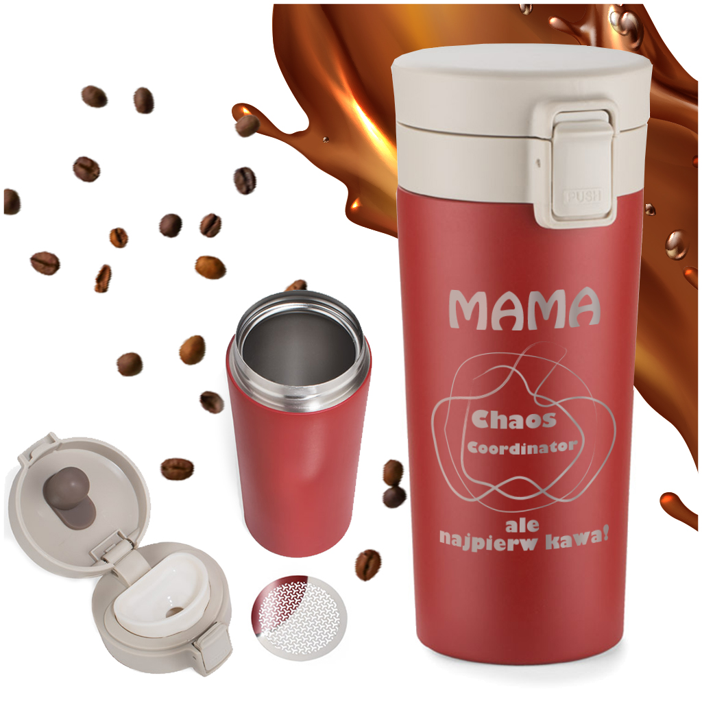 Kubek Termiczny z Grawerem dla Mamy - Prezent na Dzień Matki z Imieniem - Chaos Coordinator - Czerwony